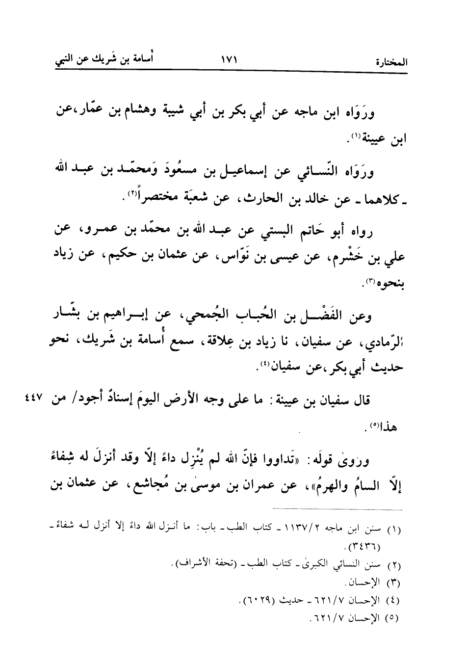 وَرَوَاهُ ابْنُ مَاجَهْ عَنْ أَبِي بَكْرِ بْنِ أَبِي شَيْبَةَ وَهِشَامُ بْنُ عَمَّارٍ عَنِ ابْنِ عُيَيْنَةَ وَرَوَاهُ النَّسَائِيُّ عَنْ إِسْمَاعِيلَ بْنِ مَسْعُودٍ وَمُحَمَّدِ بْنِ عَبْدِ اللَّهِ كِلاهُمَا عَنْ خَالِدِ بْنِ الْحَارِثِ عَنْ شُعْبَةَ مُخْتَصَرًا رَوَاهُ أَبُو حَاتِمٍ الْبُسْتِيُّ عَنْ عَبْدِ اللَّهِ بْنِ مُحَمَّدٍ بْنِ عَمْرٍو عَنْ عَلِيِّ بْنِ خَشْرَمٍ عَنْ عِيسَى بْنِ نَوَّاسٍ عَنْ عُثْمَانَ بْنِ حَكِيمٍ عَنْ زِيَادٍ بِنَحْوِهِ وَعَنِ الْفَضْلِ بْنِ الْحُبَابِ الْجُمَحِيِّ عَنْ إِبْرَاهِيمَ بْنِ بَشَّارٍ الرَّمَادِيِّ عَنْ سُفْيَانَ نَا زِيَادُ بْنُ عَلاقَةَ سَمِعَ أُسَامَةُ بْنُ شَرِيكٍ نَحْوَ حَدِيثِ أَبِي بَكْرٍ عَنْ سُفْيَانَ قَالَ سُفْيَانُ بْنُ عُيَيْنَةَ مَا عَلَى وَجْهِ الأَرْضِ الْيَوْمَ إِسْنَادٌ أَجْوَدُ مِنْ هَذَا وَرَوَى قَوْلَهُ تَدَاوُوا فَإِنَّ اللَّهَ لَمْ يُنْزِلْ دَاءً إِلا وَقَدْ أَنْزَلَ لَهُ شِفَاءً إِلا السَّامَ وَالْهَرَمَ عَنْ عِمْرَانَ بْنِ مُوسَى بْنِ مُجَاشِعٍ عَنْ عُثْمَانَ بْنِ