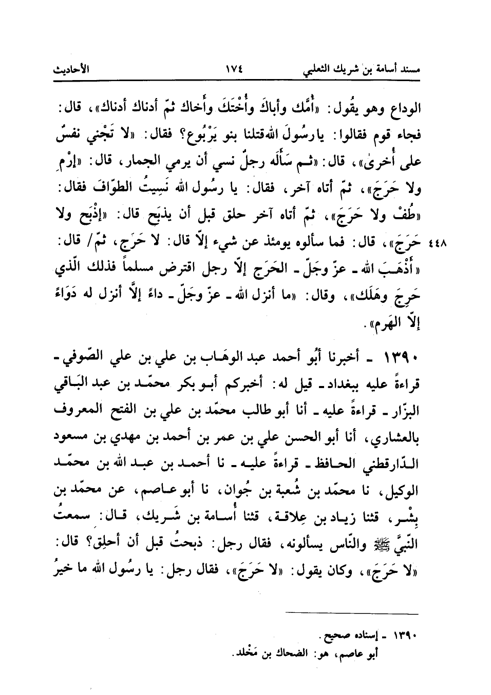 1390 - أَخْبَرَنَا أَبُو أَحْمَدَ عَبْدُ الْوَهَّابِ بْنُ عَلِيِّ بْنِ عَلِيٍّ الصُّوفِيُّ قِرَاءَةً عَلَيْهِ بِبَغْدَادَ قِيلَ لَهُ أَخْبَرَكُمْ أَبُو بَكْرٍ مُحَمَّدُ بْنُ عَبْدِ الْبَاقِي الْبَزَّارُ قِرَاءَةً عَلَيْهِ أَنا أَبُو طَالِبٍ مُحَمَّدُ بْنُ عَلِيِّ بْنِ الْفَتْحِ الْمَعْرُوفُ بِالْعُشَارِيِّ أَنا أَبُو الْحَسَنِ عَلِيُّ بْنُ عُمَرَ بْنِ أَحْمَدَ بْنِ مَهْدِيِّ بْنِ مَسْعُودٍ الدَّارَقُطْنِيُّ الْحَافِظُ قِرَاءَةً عَلَيْهِ نَا أَحْمَدُ بْنُ عَبْدِ اللَّهِ بْنِ مُحَمَّدٍ الْوَكِيلُ نَا مُحَمَّدُ بْنُ شُعْبَةَ بْنِ جَوَّانٍ نَا أَبُو عَاصِمٍ عَنْ مُحَمَّدِ بْنِ بِشْرٍ قثنا زِيَادُ بْنُ عَلاقَةَ قثنا أُسَامَةُ بْنُ شَرِيكٍ قَالَ سَمِعْتُ النَّبِيَّ صَلَّى اللَّهُ عَلَيْهِ وَسَلَّمَ وَالنَّاسُ يَسْأَلُونَهُ فَقَالَ رَجُلٌ ذَبَحْتُ قَبْلَ أَنْ أَحْلِقَ قَالَ لَا حَرَجَ وَكَانَ يَقُولُ لَا حَرَجَ فَقَالَ رَجُلٌ يَا رَسُولَ اللَّهِ مَا خَيْرُ