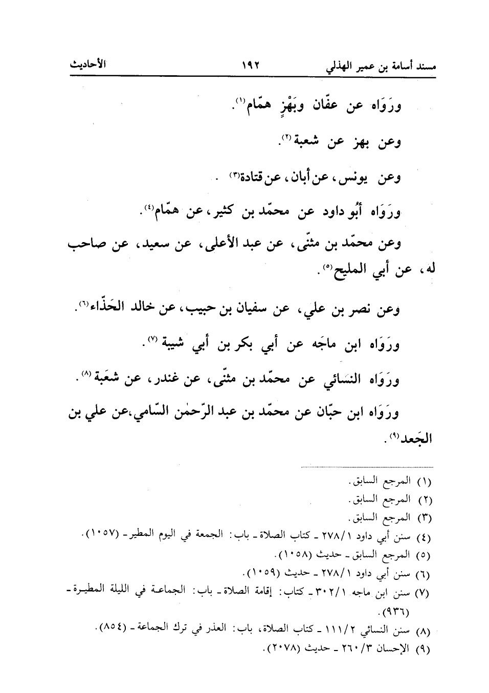 وَرَوَاهُ عَنْ عَفَّانَ وَبَهْزٍ هَمَّامٌ وَعَنْ بَهْزٍ عَنْ شُعْبَةَ وَعَنْ يُونُسَ عَنْ أَبَانٍ عَنْ قَتَادَةَ وَرَوَاهُ أَبُو دَاوُدَ عَنْ مُحَمَّدِ بْنِ كَثِيرٍ عَنْ هَمَّامٍ وَعَنْ مُحَمَّدِ بْنِ مُثَنَّى عَنْ عَبْدِ الأَعْلَى عَنْ سَعِيدٍ عَنْ صَاحِبٍ لَهُ عَنْ أَبِي الْمَلِيحِ وَعَنْ نَصْرِ بْنِ عَلِيٍّ عَنْ سُفْيَانَ بْنِ حَبِيبٍ عَنْ خَالِدٍ الْحَذَّاءِ وَرَوَاهُ ابْنُ مَاجَهْ عَنْ أَبِي بَكْرِ بْنِ أَبِي شَيْبَةَ وَرَوَاهُ النَّسَائِيُّ عَنْ مُحَمَّدِ بْنِ مُثَنَّى عَنْ غُنْدَرٍ عَنْ شُعْبَةَ وَرَوَاهُ ابْنُ حِبَّانَ عَنْ مُحَمَّدِ بْنِ عَبْدِ الرَّحْمَنِ السَّامِيُّ عَنْ عَلِيِّ بْنِ الْجَعْدِ