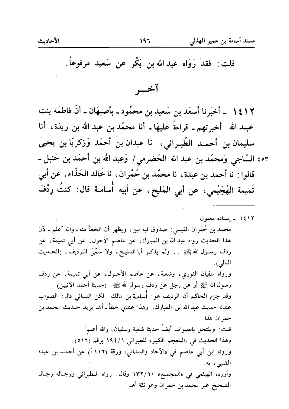 1412 - أَخْبَرَنَا أَسْعَدُ بْنُ سَعِيدِ بْنِ مَحْمُودٍ بِأَصْبَهَانَ أَنَّ فَاطِمَةَ بِنْتَ عَبْدِ اللَّهِ أَخْبَرَتْهُمْ قِرَاءَةً عَلَيْهَا أَنا مُحَمَّدُ بْنُ عَبْدِ اللَّهِ بْنِ رِيذَةَ أَنا سُلَيْمَانُ بْنُ أَحْمَدَ الطَّبَرَانِيُّ نَا عبد ان بْنُ أَحْمَدَ وَزَكَرِيَّا بْنُ يَحْيَى السَّاجِيُّ وَمُحَمَّدُ بْنُ عَبْدِ اللَّهِ الْحَضْرَمِيُّ وَعَبْدُ اللَّهِ بْنُ أَحْمَدَ بْنِ حَنْبَلٍ قَالُوا نَا أَحْمَدُ بْنُ عَبْدَةَ نَا مُحَمَّدُ بْنُ حُمْرَانَ نَا خَالِدٌ الْحَذَّاءُ عَنْ أَبِي تَمِيمَةَ الْهُجَيْمِيِّ عَنْ أَبِي الْمَلِيحِ عَنْ أَبِيهِ أُسَامَةَ قَالَ كُنْتُ رِدْفَ رَسُول الله