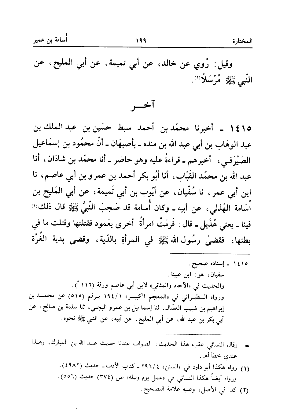 1415 - أَخْبَرَنَا مُحَمَّدُ بْنُ أَحْمَدَ سِبْطُ حُسَيْنِ بْنِ عَبْدِ الْمَلِكِ بْنِ عَبْدِ الْوَهَّابِ بْنِ أَبِي عَبْدِ اللَّهِ بْنِ مَنْدَهْ بِأَصْبَهَانَ أَنَّ مَحْمُودَ بْنَ إِسْمَاعِيلَ الصَّيْرَفِيَّ أَخْبَرَهُمْ قِرَاءَةً عَلَيْهِ وَهُوَ حَاضِرٌ أَنا مُحَمَّدُ بْنُ شَاذَانَ أَنا عَبْدُ اللَّهِ بْنُ مُحَمَّدٍ الْقَبَّابُ أَنا أَبُو بَكْرٍ أَحْمَدُ بْنُ عَمْرِو بْنِ أَبِي عَاصِمٍ نَا ابْنُ أَبِي عُمَرَ نَا سُفْيَانُ عَنْ أَيُّوبَ بْنِ أَبِي تَمِيمَةَ عَنْ أَبِي الْمَلِيحِ بْنِ أُسَامَةَ الْهُذَلِيِّ عَنْ أَبِيهِ وَكَانَ أُسَامَةُ قَدْ صَحِبَ النَّبِيَّ صَلَّى اللَّهُ عَلَيْهِ وَسَلَّمَ قَالَ ذَلِكَ فِينَا يَعْنِي هُذَيْلَ قَالَ فَرَمَتِ امْرَأَةٌ أُخْرَى بِعَمُودٍ فَقَتَلَتْهَا وَقَتَلَتْ مَا فِي بَطْنِهَا فَقَضَى رَسُولُ اللَّهِ صَلَّى اللَّهُ عَلَيْهِ وَسَلَّمَ فِي الْمَرْأَةِ بِالدِّيَةِ وَقَضَى بِدِيَةِ الْغُرَّةِ