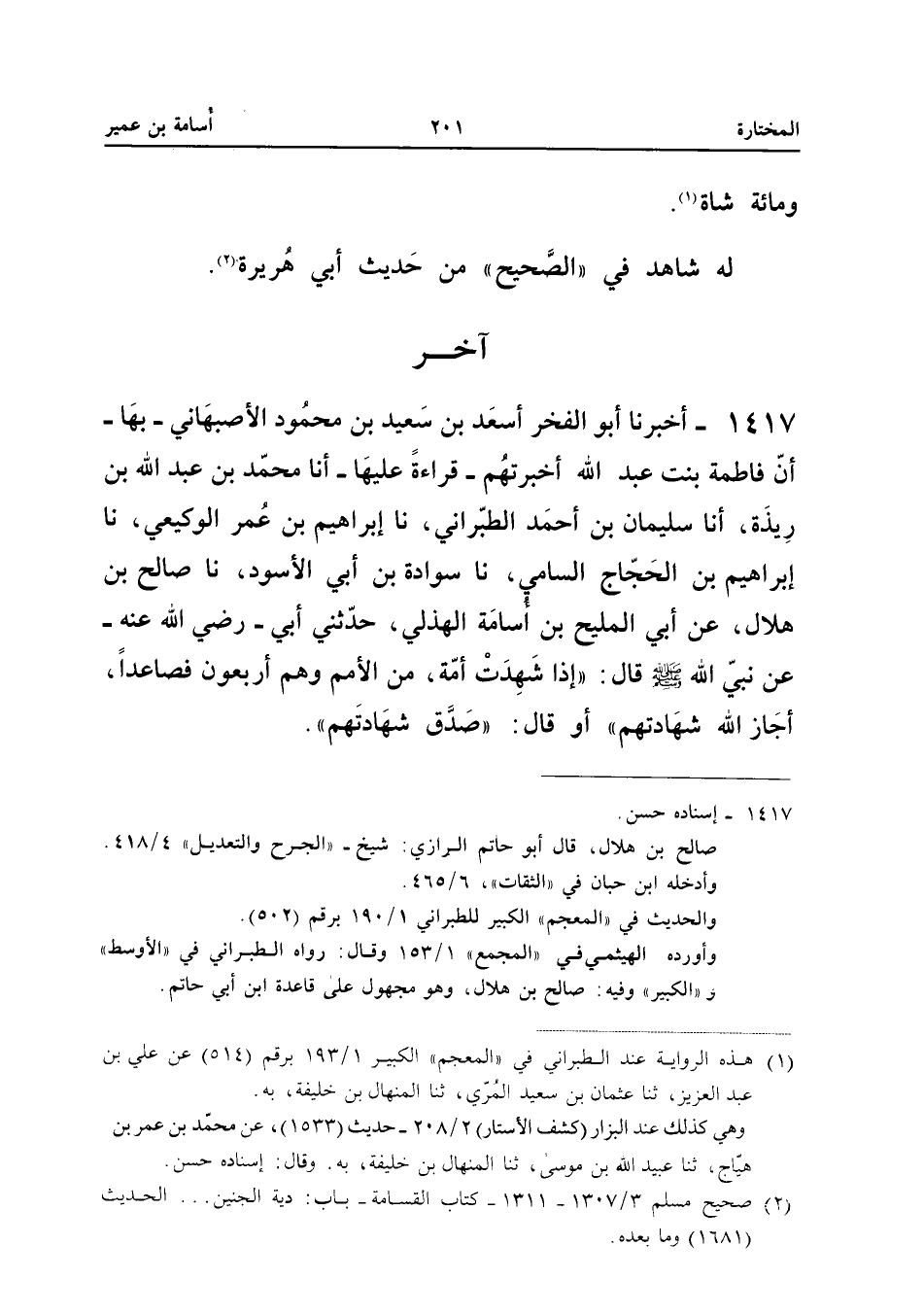 1417 - أَخْبَرَنَا أَبُو الْفَخْرِ أَسْعَدُ بْنُ سَعِيدِ بْنِ مَحْمُودٍ الأَصْبَهَانِيُّ بِهَا أَنَّ فَاطِمَةَ بِنْتَ عَبْدِ اللَّهِ أَخْبَرَتْهُمْ قِرَاءَةً عَلَيْهَا أَنا مُحَمَّدُ بْنُ عَبْدِ اللَّهِ بْنِ رِيذَةَ أَنَا سُلَيْمَانُ بْنُ أَحْمَدَ الطَّبَرَانِيُّ نَا إِبْرَاهِيمُ بْنُ عُمَرَ الْوَكِيعِيُّ نَا إِبْرَاهِيمُ بْنُ الْحَجَّاجِ السَّامِيُّ نَا سَوَادَةُ بْنُ أَبِي الأَسْوَدِ نَا صَالِحُ بْنُ هِلالٍ عَنْ أَبِي الْمَلِيحِ بْنِ أُسَامَةَ الْهُذَلِيِّ حَدَّثَنِي أَبِي رَضِيَ اللَّهُ عَنْهُ عَنْ نَبِيِّ اللَّهِ صَلَّى اللَّهُ عَلَيْهِ وَسَلَّمَ قَالَ إِذَا شَهِدَتْ أُمَّةٌ مِنَ الأُمَمِ وَهُمْ أَرْبَعُونَ فَصَاعِدًا أَجَازَ اللَّهُ شَهَادَتَهُمْ أَوْ قَالَ صَدَّقَ شَهَادَتِهِمْ