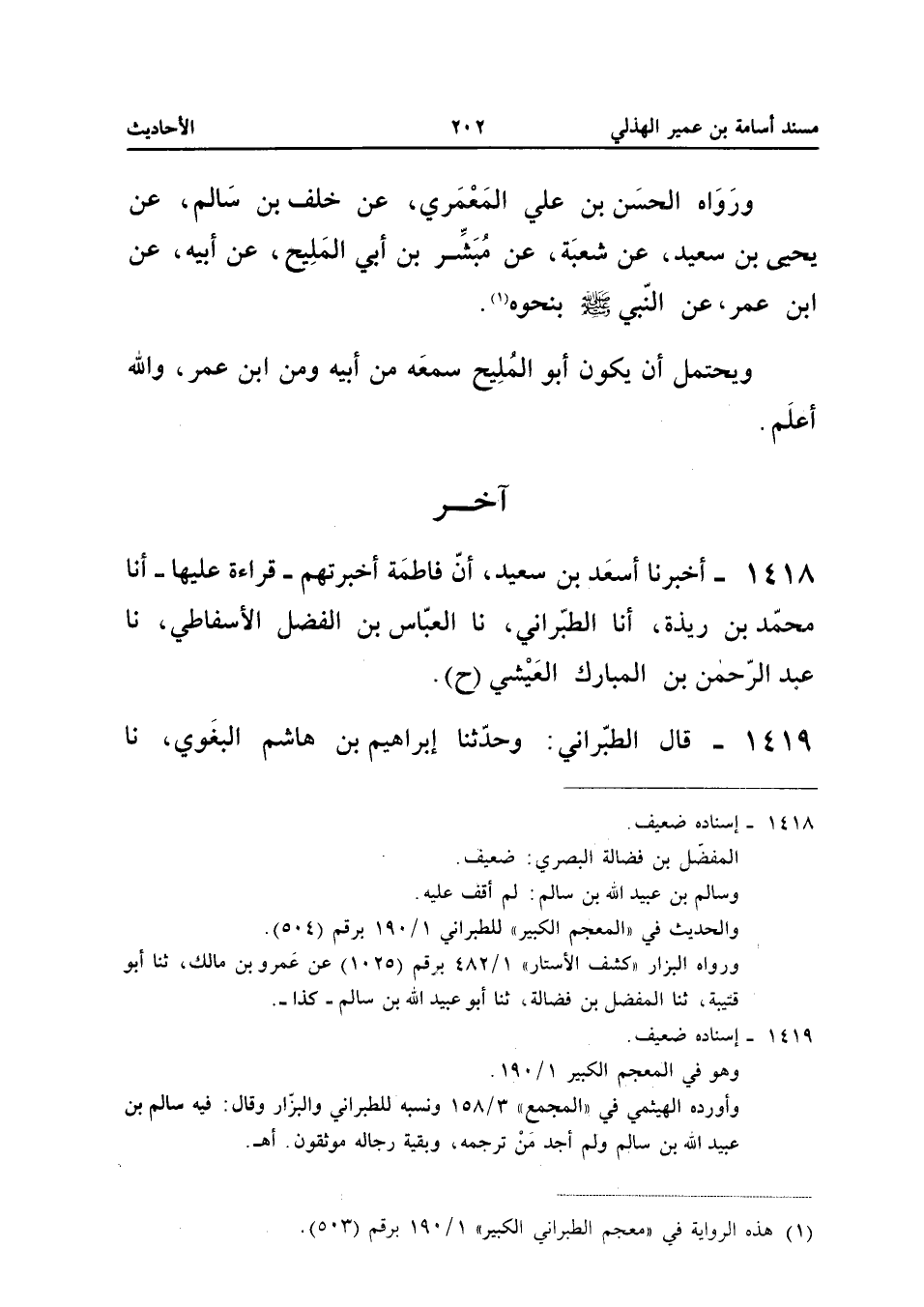 1419 - قَالَ الطَّبَرَانِيُّ وَحدثنا إِبْرَاهِيمُ بْنُ هَاشِمٍ الْبَغَوِيُّ نَا مُوسَى بن حَيَّان الْبَصْرِيُّ نَا أَبُو قُتَيْبَةَ نَا الْمُفَضَّلُ بْنُ فَضَالَةَ عَنْ سَالِمِ بْنِ عُبَيْدِ اللَّهِ بْنِ سَالِمٍ عَنْ أَبِي الْمَلِيحِ عَنْ أَبِيهِ قَالَ قَالَ رَسُولُ اللَّهِ