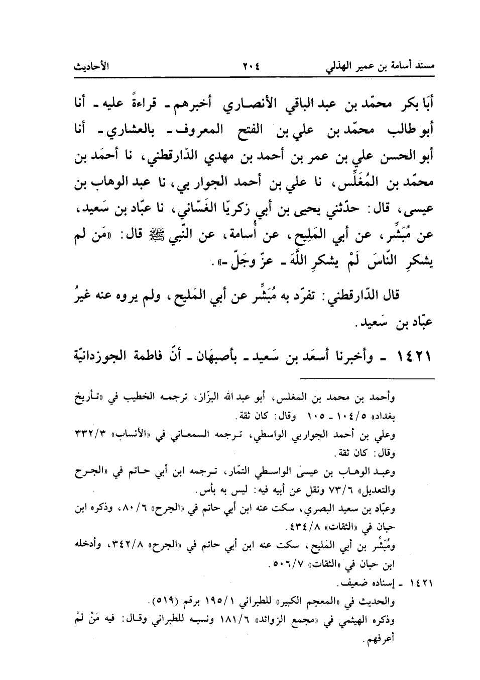 1421 - وَأَخْبَرَنَا أَسْعَدُ بْنُ سَعِيدٍ بِأَصْبَهَانَ أَنَّ فَاطِمَةَ الْجَوْزِدَانِيَّةَ أَخْبَرَتْهُمْ أَنا مُحَمَّدُ بْنُ عَبْدِ اللَّهِ أَنا سُلَيْمَانُ بْنُ أَحْمَدَ نَا الْحُسَيْنُ بْنُ إِسْحَاقَ التُّسْتَرِيُّ وَمُحَمَّدُ بْنُ عَبْدِ اللَّهِ الْحَضْرَمِيُّ قَالا نَا مُحَمَّدُ بْنُ أَبِي سَمِينَةَ نَا عَبْدُ الْوَهَّابِ بْنُ عِيسَى التَّمَّارُ نَا يَحْيَى بْنُ أَبِي زَكَرِيَّا نَا عَبَّادُ بْنُ سَعِيدٍ عَنْ مُبَشِّرِ بْنِ أَبِي الْمَلِيحِ عَنْ أَبِي الْمَلِيحِ عَنْ أَبِيهِ عَنِ النَّبِيِّ صَلَّى اللَّهُ عَلَيْهِ وَسَلَّمَ قَالَ لَا يَشْكُرُ اللَّهَ مَنْ لَا يَشْكُرُ النَّاسَ وَقَدْ رُوِيَ مِثْلُهُ عَنِ الْأَشْعَث بن قيس يَأْتِي فِيمَا بعد إِسْنَاده ضَعِيف