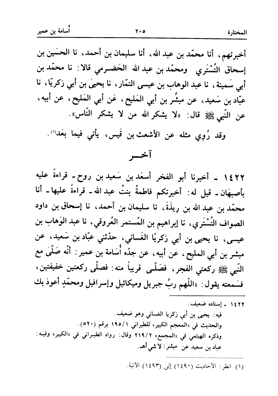 1422 - أَخْبَرَنَا أَبُو الْفَخْرِ أَسْعَدُ بْنُ سَعِيدِ بْنِ رَوْحٍ قِرَاءَةً عَلَيْهِ بِأَصْبَهَانَ قِيلَ لَهُ أَخْبَرَتْكُمْ فَاطِمَةُ بِنْتُ عَبْدِ اللَّهِ قِرَاءَةً عَلَيْهَا أَنا مُحَمَّدُ بْنُ عَبْدِ اللَّهِ بْنِ رِيذَةَ نَا سُلَيْمَانُ بْنُ أَحْمَدَ نَا إِسْحَاقُ بْنُ دَاوُدَ الصَّوَّافُ التُّسْتَرِيُّ نَا إِبْرَاهِيمُ بْنُ الْمُسْتَمِرِّ الْعُرُوقِيُّ نَا عَبْدُ الْوَهَّابِ بْنُ عِيسَى نَا يَحْيَى بْنُ أَبِي زَكَرِيَّا الْغَسَّانِيُّ حَدَّثَنِي عَبَّادُ بْنُ سَعِيدٍ عَنْ مُبَشِّرِ بْنِ أَبِي الْمَلِيحِ عَنْ أَبِيهِ عَنْ جَدِّهِ أُسَامَةَ بْنِ عُمَيْرٍ أَنَّهُ صَلَّى مَعَ النَّبِيِّ صَلَّى اللَّهُ عَلَيْهِ وَسَلَّمَ رَكْعَتَيِ الْفَجْرِ فَصَلَّى قَرِيبًا مِنْهُ فَصَلَّى رَكْعَتَيْنِ خَفِيفَتَيْنِ فَسَمِعْتُهُ يَقُولُ اللَّهُمَّ رَبَّ جِبْرِيلَ وَمِيكَائِيلَ وَإِسْرَافِيلَ وَمُحَمَّدٍ أَعُوذُ بِكَ