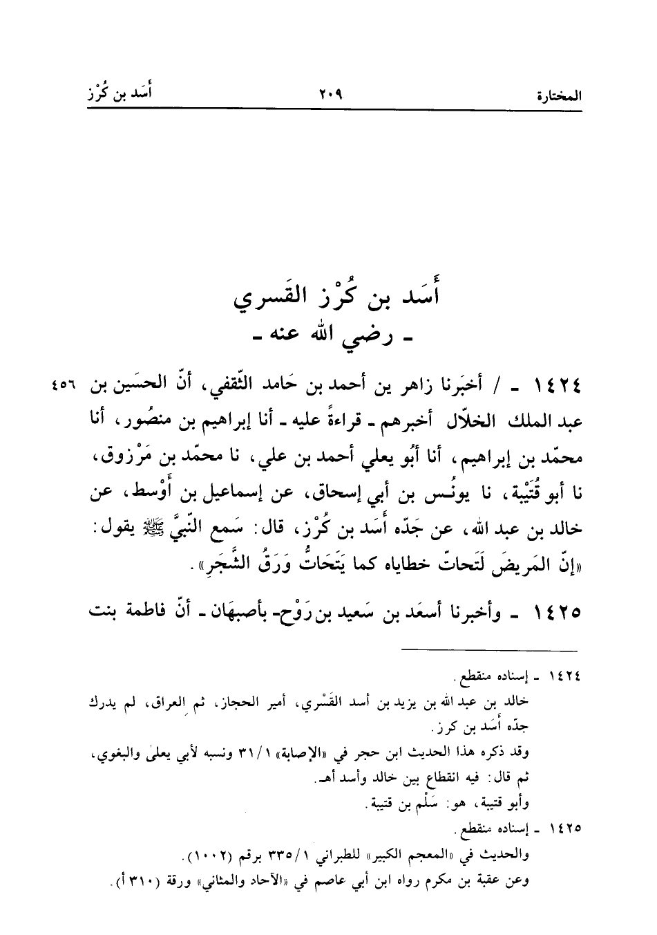 1424 - أَخْبَرَنَا زَاهِرُ بْنُ أَحْمَدَ بْنِ حَامِدٍ الثَّقَفِيُّ أَنَّ الْحُسَيْنَ بْنَ عَبْدِ الْمَلِكِ الْخَلالَ أَخْبَرَهُمْ قِرَاءَةً عَلَيْهِ أَنا إِبْرَاهِيمُ بْنُ مَنْصُورٍ أَنا مُحَمَّدُ بْنُ إِبْرَاهِيمَ أَنا أَبُو يَعْلَى أَحْمَدُ بْنُ عَلِيٍّ نَا مُحَمَّدُ بْنُ مَرْزُوقٍ نَا أَبُو قُتَيْبَةَ نَا يُونُسُ بْنُ أَبِي إِسْحَاقَ عَنْ إِسْمَاعِيلَ بْنِ أَوْسَطَ عَنْ خَالِدِ بْنِ عَبْدِ اللَّهِ عَنْ جَدِّهِ أَسَدِ بْنِ كُرْزٍ قَالَ سَمِعَ النَّبِيَّ صَلَّى اللَّهُ عَلَيْهِ وَسَلَّمَ يَقُولُ إِنَّ الْمَرِيضَ لَتَحَاتُّ خَطَايَاهُ كَمَا يَتَحَاتُّ ورق الشّجر إِسْنَاده مُنْقَطع