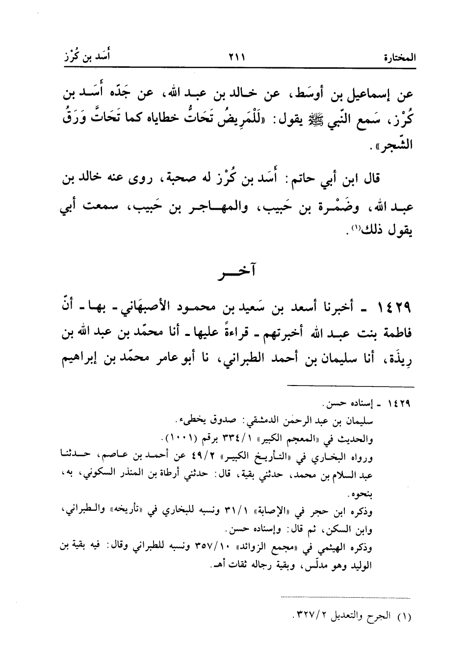 صَلَّى اللَّهُ عَلَيْهِ وَسَلَّمَ يَقُولُ لَلْمَرِيضُ تَحَاتُّ خَطَايَاهُ كَمَا تَحَاتُّ وَرَقُ الشَّجَرِ قَالَ ابْنُ أَبِي حَاتِمٍ أَسَدُ بْنُ كُرْزٍ لَهُ صُحْبَةٌ رَوَى عَنْهُ خَالِدُ بْنُ عَبْدِ اللَّهِ وَضَمْرَةُ بْنُ حَبِيبٍ وَالْمُهَاجِرُ بْنُ حَبِيبٍ سَمِعْتُ أَبِي يَقُول ذَلِك