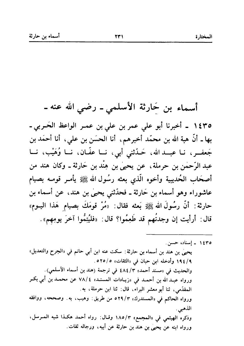 1435 - أَخْبَرَنَا أَبُو عَلِيٍّ عُمَرُ بْنُ عَلِيِّ بْنِ عُمَرَ الْوَاعِظُ الْحَرْبِيُّ بِهَا أَنَّ هِبَةَ اللَّهِ بْنَ مُحَمَّدٍ أَخْبَرَهُمْ أَنَا الْحَسَنُ بْنُ عَلِيٍّ أَنا أَحْمَدُ بْنُ جَعْفَرٍ نَا عَبْدُ اللَّهِ حَدَّثَنِي أَبِي نَا عَفَّانُ نَا وُهَيْبٌ نَا عَبْدُ الرَّحْمَنِ بْنُ حَرْمَلَةَ عَنْ يَحْيَى بْنِ هِنْدِ بْنِ حَارِثَةَ وَكَانَ هِنْدٌ مِنْ أَصْحَابِ الْحُدَيْبِيَةِ وَأَخُوهُ الَّذِي بَعَثَهُ رَسُولُ اللَّهِ صَلَّى اللَّهُ عَلَيْهِ وَسَلَّمَ يَأْمُرُ قَوْمَهُ بِصِيَامِ عَاشُورَاءَ وَهُوَ أَسْمَاءُ بْنُ حَارِثَةَ فَحَدَّثَنِي يَحْيَى بْنُ هِنْدٍ عَنْ أَسْمَاءَ بْنِ حَارِثَةَ أَنَّ رَسُولَ اللَّهِ صَلَّى اللَّهُ عَلَيْهِ وَسَلَّمَ بَعَثَهُ فَقَالَ مُرْ قَوْمَكَ بِصِيَامِ هَذَا الْيَوْمِ قَالَ أَرَأَيْتَ إِنْ وَجَدْتُهُمْ قَدْ طَعِمُوا قَالَ فَلْيُتِمُّوا آخِرَ يومهم