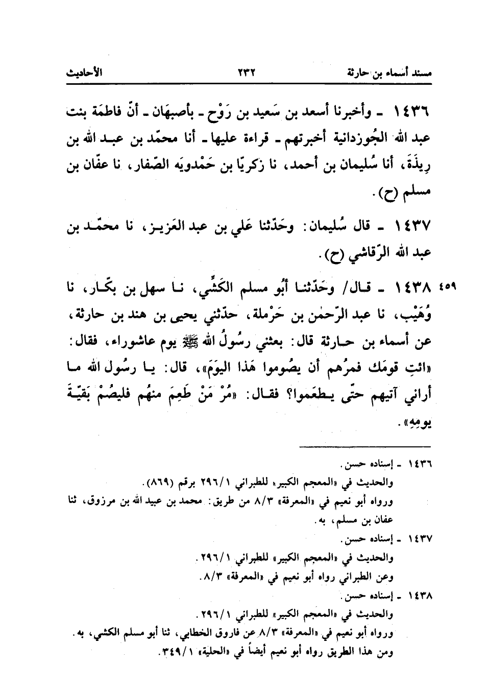 1438 - قَالَ وَحدثنا أَبُو مُسْلِمٍ الْكَشِّيُّ نَا سَهْلُ بْنُ بَكَّارٍ نَا وُهَيْبٌ نَا عَبْدُ الرَّحْمَنِ بْنُ حَرْمَلَةَ حَدَّثَنِي يَحْيَى بْنُ هِنْدِ بْنِ حَارِثَةَ عَنْ أَسْمَاءَ بْنِ حَارِثَةَ قَالَ بَعَثَنِي رَسُولُ اللَّهِ صَلَّى اللَّهُ عَلَيْهِ وَسَلَّمَ يَوْمَ عَاشُورَاءَ فَقَالَ ائْتِ قَوْمَكَ فَمُرْهُمْ أَنْ يَصُومُوا هَذَا الْيَوْمَ قَالَ يَا رَسُولَ اللَّهِ مَا أَرَانِي آتِيهِمْ حَتَّى يَطْعَمُوا فَقَالَ مُرْ مَنْ طَعِمَ مِنْهُمْ فَلْيَصُمْ بَقِيَّةَ يَوْمِهِ