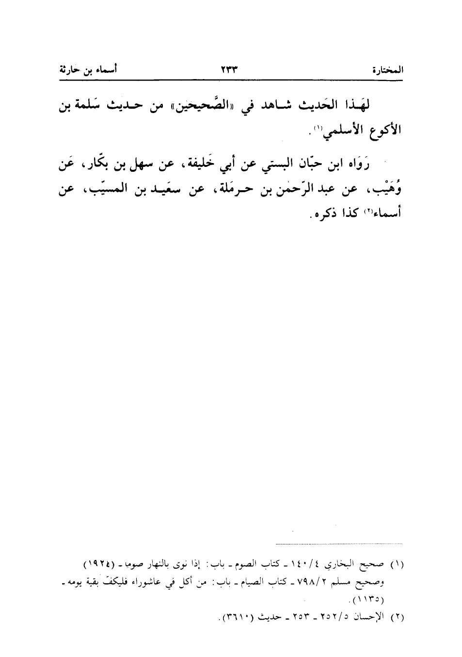 لِهَذَا الْحَدِيثِ شَاهِدٌ فِي الصَّحِيحَيْنِ مِنْ حَدِيثِ سَلَمَةَ بْنِ الأَكْوَعِ الأَسْلَمِيِّ رَوَاهُ ابْنُ حِبَّانَ الْبُسْتِيُّ عَنْ أَبِي خَلِيفَةَ عَنْ سَهْلِ بْنِ بَكَّارٍ عَنْ وُهَيْبٍ عَنْ عَبْدِ الرَّحْمَنِ بْنِ حَرْمَلَةَ عَنْ سَعِيدِ بْنِ الْمُسَيِّبِ عَنْ أَسْمَاءَ كَذَا ذكره