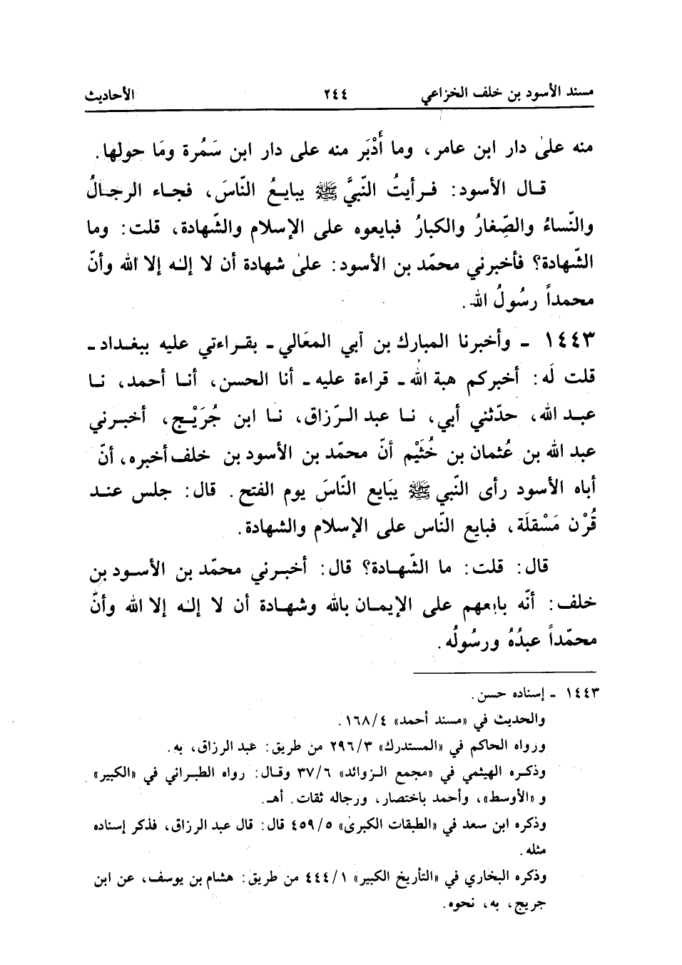 1443 - وأَخْبَرَنَا الْمُبَارَكُ بْنُ أَبِي الْمَعَالِي بِقِرَاءَتِي عَلَيْهِ بِبَغْدَادَ قُلْتُ لَهُ أخبركُمْ هِبَةُ اللَّهِ قِرَاءَةً عَلَيْهِ أَنا الْحَسَنُ أَنا أَحْمَدُ نَا عَبْدُ اللَّهِ حَدَّثَنِي أَبِي نَا عَبْدُ الرَّزَّاقِ نَا ابْنِ جُرَيْجٍ أخبرنِي عَبْدُ اللَّهِ بْنُ عُثْمَانَ بْنِ خَثْيَمٍ أَنَّ مُحَمَّدَ بْنَ الأَسْوَدِ بْنِ خَلَفٍ أخبرهُ أَنَّ أَبَاهُ الأَسْوَدَ رَأَى النَّبِيَّ صَلَّى اللَّهُ عَلَيْهِ وَسَلَّمَ يُبَايِعُ النَّاسَ يَوْمَ الْفَتْحِ قَالَ جَلَسَ عِنْدَ قَرْنِ مَسْقَلَةَ فَبَايَعَ النَّاسَ عَلَى الإِسْلامِ وَالشَّهَادَةِ قَالَ قُلْتُ مَا الشَّهَادَةُ قَالَ أخبرنِي مُحَمَّدُ بْنُ الأَسْوَدِ بْنِ خَلَفٍ أَنَّهُ بَايَعَهُمْ عَلَى الإِيمَانِ بِاللَّهِ وَشَهَادَةِ أَنْ لَا إِلَهَ إِلا اللَّهُ وَأَنَّ مُحَمَّدًا عَبده وَرَسُوله