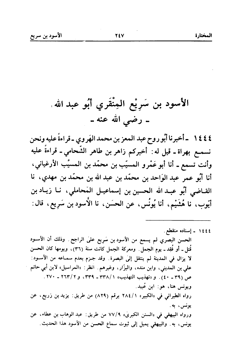 1444 - أَخْبَرَنَا أَبُو رَوْحٍ عَبْدُ الْمُعِزِّ بْنُ مُحَمَّدٍ الْهَرَوِيُّ قِرَاءَةً عَلَيْهِ وَنَحْنُ نَسْمَعُ بِهَرَاةَ قِيلَ لَهُ أخبركُمْ زَاهِرُ بْنُ طَاهِرٍ الشَّحَّامِيُّ قِرَاءَةً عَلَيْهِ وَأَنْتَ تَسْمَعُ أَنا أَبُو عَمْرٍو الْمُسَيَّبُ بْنُ مُحَمَّدِ بْنِ الْمُسَيَّبِ الأَرْغِيَانِيُّ أَنا أَبُو عُمَرَ عَبْدُ الْوَاحِدِ بْنُ مُحَمَّدِ بْنِ عَبْدِ اللَّهِ بْنِ مُحَمَّدِ بْنِ مَهْدِيٍّ نَا الْقَاضِي أَبُو عَبْدِ اللَّهِ الْحُسَيْنُ بْنُ إِسْمَاعِيلَ الْمَحَامِلِيُّ نَا زِيَادُ بْنُ أَيُّوبَ نَا هُشَيْمٌ أَنا يُونُسُ عَنِ الْحَسَنِ نَا الأَسْوَدُ بْنُ سَرِيعٍ قَالَ كُنَّا فِي غَزَاةٍ فَأَصَبْنَا ظَفَرًا وَقَتَلْنَا فِي الْمُشْرِكِينَ حَتَّى بَلَغَ بِهِمُ الْقَتْلُ إِلَى أَنْ قَتَلُوا الذُّرِّيَّةَ فَبَلَغَ ذَلِكَ النَّبِيَّ