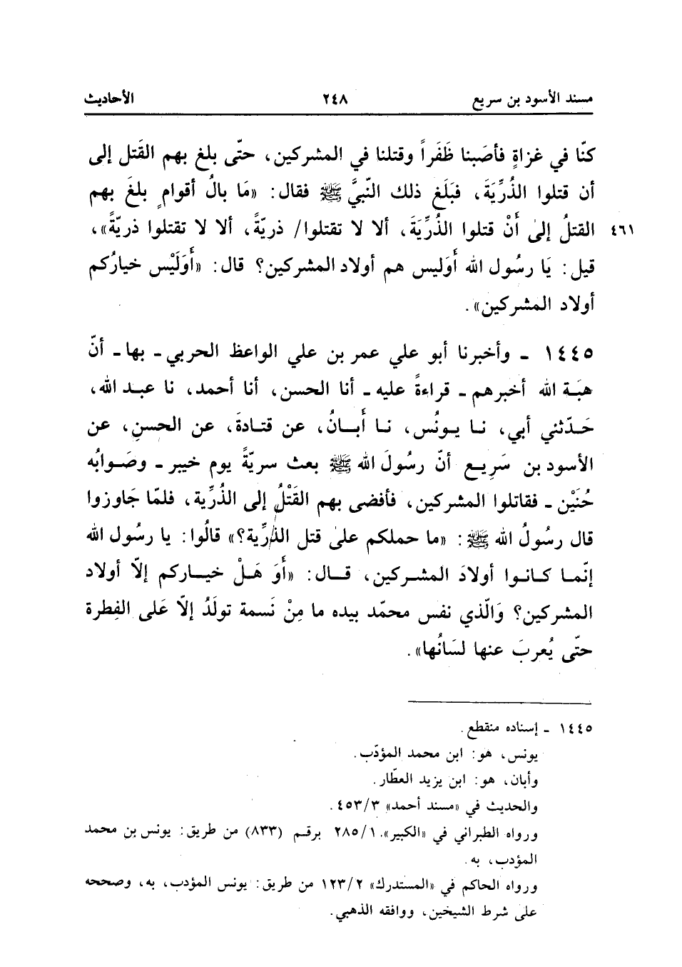 1445 - وَأَخْبَرَنَا أَبُو عَلِيٍّ عُمَرُ بْنُ عَلِيٍّ الْوَاعِظُ الْحَرْبِيُّ بِهَا أَنَّ هِبَةَ اللَّهِ أَخْبَرَهُمْ قِرَاءَةً عَلَيْهِ أَنا الْحَسَنُ أَنا أَحْمَدُ نَا عَبْدُ اللَّهِ حَدَّثَنِي أَبِي نَا يُونُسُ نَا أَبَانٌ عَنْ قَتَادَةَ عَنِ الْحَسَنِ عَنِ الأَسْوَدِ بْنِ سَرِيعٍ أَنَّ رَسُولَ اللَّهِ صَلَّى اللَّهُ عَلَيْهِ وَسَلَّمَ بَعَثَ سَرِيَّةً يَوْمَ خَيْبَرَ وَصَوَابُهُ حُنَيْنٌ فَقَاتَلُوا الْمُشْرِكِينَ فَأَفْضَى بِهِمُ الْقَتْلُ إِلَى الذُّرِّيَّةَ فَلَمَّا جَاوَزُوا قَالَ رَسُولُ اللَّهِ صَلَّى اللَّهُ عَلَيْهِ وَسَلَّمَ مَا حَمَلَكُمْ عَلَى قَتْلِ الذُّرِّيَّةِ قَالُوا يَا رَسُولَ اللَّهِ إِنَّمَا كَانُوا أَوْلادَ الْمُشْرِكِينَ قَالَ أَوْ هَلْ خِيَارُكُمْ إِلا أَوْلادُ الْمُشْرِكِينَ وَالَّذِي نَفْسُ مُحَمَّدٍ بِيَدِهِ مَا مِنْ نَسَمَةٍ تُولَدُ إِلا عَلَى الْفِطْرَةِ حَتَّى يُعْرِبَ عَنْهَا لسانها