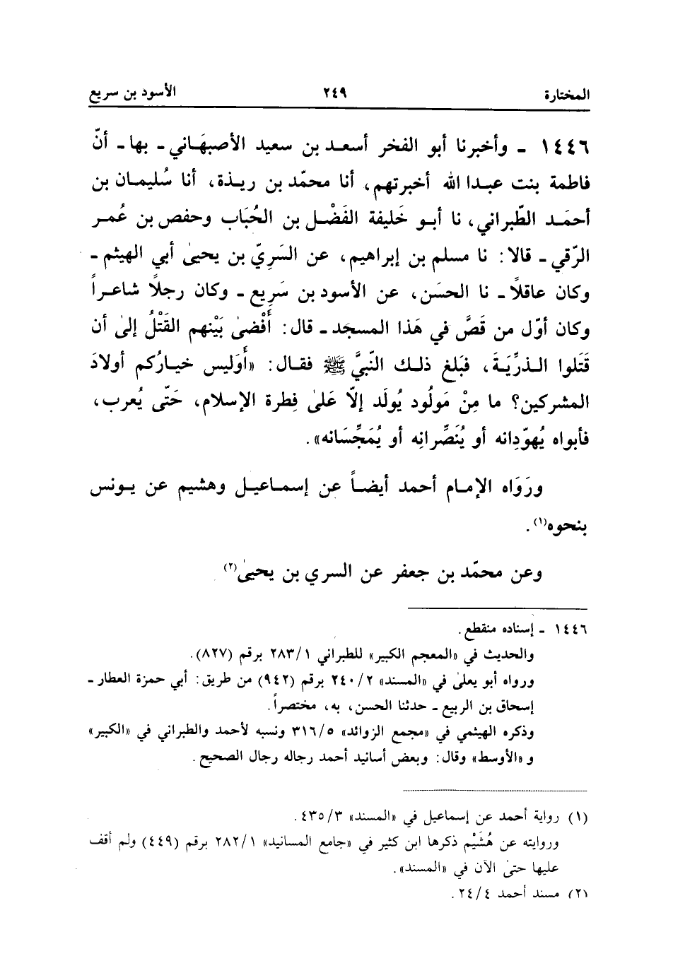 1446 - وَأَخْبَرَنَا أَبُو الْفَخْرِ أَسْعَدُ بْنُ سَعِيدٍ الأَصْبَهَانِيُّ بِهَا أَنَّ فَاطِمَةَ بِنْتَ عَبْدِ اللَّهِ أَخْبَرَتْهُمْ أَنا مُحَمَّدُ بْنُ رِيذَةَ أَنا سُلَيْمَانُ بْنُ أَحْمَدَ الطَّبَرَانِيُّ نَا أَبُو خَلِيفَةَ الْفَضْلُ بْنُ الْحُبَابِ وَحَفْصُ بْنُ عُمَرَ الرَّقِّيُّ قَالا نَا مُسْلِمُ بْنُ إِبْرَاهِيمَ عَنِ السُّرِّيِّ بْنِ يَحْيَى أَبِي الْهَيْثَمِ وَكَانَ عَاقِلا نَا الْحَسَنُ عَنِ الأَسْوَدِ بْنِ سَرِيعٍ وَكَانَ رَجُلا شَاعِرًا وَكَانَ أَوَّلَ مَنْ قَصَّ فِي هَذَا الْمَسْجِدِ قَالَ أَفْضَى بَيْنَهُمُ الْقَتْلُ إِلَى أَنْ قَتَلُوا الذُّرِّيَّةَ فَبَلَغَ ذَلِكَ النَّبِيَّ صَلَّى اللَّهُ عَلَيْهِ وَسَلَّمَ فَقَالَ أَوَلَيْسَ خِيَارُكُمْ أَوْلادُ الْمُشْرِكِينَ مَا مِنْ مَوْلُودٍ يُولَدُ إِلا عَلَى فِطْرَةِ الإِسْلامِ حَتَّى يُعْرِبَ فَأَبَوَاهُ يُهَوِّدَانِهِ أَوْ يُنَصِّرَانِهِ أَوْ يُمَجِّسَانِهِ وَرَوَاهُ الإِمَامُ أَحْمَدُ أَيْضًا عَنْ إِسْمَاعِيلَ وَهُشَيْمٍ عَنْ يُونُسَ بِنَحْوِهِ وَعَنْ مُحَمَّدِ بْنِ جَعْفَرٍ عَنِ السُّرِّيِّ بْنِ يَحْيَى