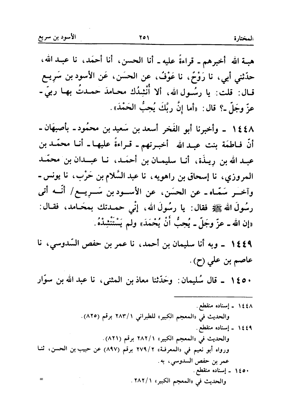 1450 - قَالَ سُلَيْمَانُ وَحدثنا مُعَاذُ بْنُ الْمُثَنَّى نَا عَبْدُ اللَّهِ بْنُ سَوَّارٍ الْعَنْبَرِيُّ قَالا نَا عَبْدُ اللَّهِ بْنُ بَكْرٍ الْمُزْنِيُّ عَنِ الْحَسَنِ قَالَ قَالَ الأَسْوَدُ بْنُ سَرِيعٍ أَلا أُنْشِدُكَ مَحَامِدَ حَمِدْتُ بِهَا رَبِّي قَالَ إِنَّ رَبَّكَ يحب الْحَمد وَلم يستزده على ذَلِك إِسْنَاده مُنْقَطع
