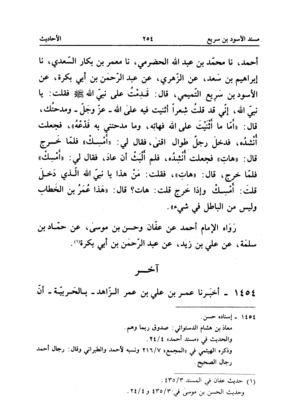 صَلَّى اللَّهُ عَلَيْهِ وَسَلَّمَ فَقُلْتُ يَا نَبِيَّ اللَّهِ إِنِّي قَدْ قُلْتُ شِعْرًا أَثْنَيْتُ فِيهِ عَلَى اللَّهِ عَزَّ وَجَلَّ وَمَدَحْتُكَ قَالَ أَمَا مَا أَثْنَيْتُ عَلَى اللَّهِ فَهَاتِهِ وَمَا مَدَحْتَنِي بِهِ فَدَعْهُ فَجَعَلْتُ أُنْشِدُهُ فَدَخَلَ رَجُلٌ طُوَالٌ أَقْنَى فَقَالَ لِي أَمْسِكْ فَلَمَّا خَرَجَ قَالَ هَاتِ فَجَعَلْتُ أُنْشِدُهُ فَلَمْ أَلْبَثْ أَنْ عَادَ فَقَالَ لِي أَمْسِكْ فَلَمَّا خَرَجَ قَالَ هَاتِ فَقُلْتُ مَنْ هَذَا يَا نَبِيَّ اللَّهِ الَّذِي دَخَلَ قُلْتَ أَمْسِكْ وَإِذَا خَرَجَ قُلْتَ هَاتِ قَالَ هَذَا عُمَرُ بْنُ الْخَطَّابِ وَلَيْسَ مِنَ الْبَاطِلِ فِي شَيْءٍ رَوَاهُ الإِمَامُ أَحْمَدُ عَنْ عَفَّانَ وَحَسَنُ بْنُ مُوسَى عَنْ حَمَّادِ بْنِ سَلَمَةَ عَنْ عَلِيِّ بْنِ زَيْدٍ عَنْ عَبْدِ الرَّحْمَن بن أبي بكرَة