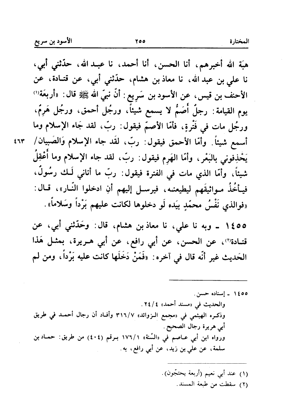 الْحَسَنُ أَنا أَحْمَدُ نَا عَبْدُ اللَّهِ حَدَّثَنِي أَبِي نَا عَلِيُّ بْنُ عَبْدِ اللَّهِ نَا مُعَاذُ بْنُ هِشَامٍ حَدَّثَنِي أَبِي عَنْ قَتَادَةَ عَنِ الأَحْنَفِ بْنِ قَيْسٍ عَنِ الأَسْوَدِ بْنِ سَرِيعٍ أَنَّ نَبِيَّ اللَّهِ صَلَّى اللَّهُ عَلَيْهِ وَسَلَّمَ قَالَ أَرْبَعَةٌ يَوْمَ الْقِيَامَةِ رَجُلٌ أَصَمُ لَا يَسْمَعُ شَيْئًا وَرَجُلٌ أَحْمَقُ وَرَجُلٌ هَرِمٌ وَرَجُلٌ مَاتَ فِي فَتْرَة فَأَما الصم فَيَقُولُ رَبِّ لَقَدْ جَاءَ الإِسْلامُ وَمَا أَسْمَعُ شَيْئًا وَأَمَّا الأَحْمَقُ فَيَقُولُ رَبِّ لَقَدْ جَاءَ الإِسْلامُ وَالصِّبْيَانُ يَحْذِفُونِي بِالْبَعْرِ وَأَمَّا الْهَرِمُ فَيَقُولُ رَبِّ لَقَدْ جَاءَ الإِسْلامُ وَمَا أَعْقِلُ شَيْئًا وَأَمَّا الَّذِي مَاتَ فِي الْفَتْرَةِ فَيَقُولُ رَبِّ مَا أَتَانِي لَكَ رَسُولٌ فَيَأْخُذُ مَوَاثِيقَهُمْ ليُطِيعَنَّهُ فَيُرْسِلُ إِلَيْهِمْ أَنِ ادْخُلُوا النَّارَ قَالَ فَوَالَّذِي نَفْسُ مُحَمَّدٍ بِيَدِهِ لَوْ دَخَلُوهَا لَكَانَتْ عَلَيْهِمْ بردا وَسلَامًا إِسْنَاده حسن