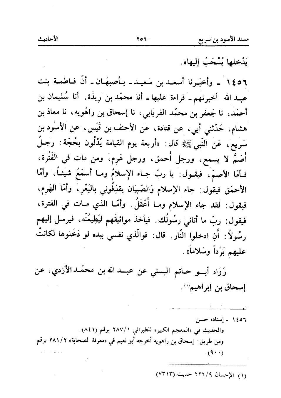 1456 - وَأَخْبَرَنَا أَسْعَدُ بْنُ سَعِيدٍ بِأَصْبَهَانَ أَنَّ فَاطِمَةَ بِنْتَ عَبْدِ اللَّهِ أَخْبَرَتْهُمْ قِرَاءَةً عَلَيْهَا أَنا مُحَمَّدُ بْنُ رِيذَةَ أَنا سُلَيْمَانُ بْنُ أَحْمَدَ نَا جَعْفَرُ بْنُ مُحَمَّدٍ الْفِرْيَابِيُّ نَا إِسْحَاقُ بْنُ رَاهَوَيْهِ نَا مُعَاذُ بْنُ هِشَامٍ حَدَّثَنِي أَبِي عَنْ قَتَادَةَ عَنِ الأَحْنَفِ بْنِ قَيْسٍ عَنِ الأَسْوَدِ بْنِ سَرِيعٍ عَنِ النَّبِيِّ صَلَّى اللَّهُ عَلَيْهِ وَسَلَّمَ قَالَ أَرْبَعَةٌ يَوْمَ الْقِيَامَةِ يُدْلُونَ بِحُجَّةٍ رَجُلٌ أَصَمُّ لَا يَسْمَعُ وَرَجُلٌ أَحْمَقُ وَرَجُلٌ هَرِمٌ وَمَنْ مَاتَ فِي الْفَتْرَةِ فَأَمَّا الأَصَمُّ فَيَقُولُ يَا رَبِّ جَاءَ الإِسْلامُ مَا أَسْمَعُ شَيْئًا وَأَمَّا الأَحْمَقُ فَيَقُولُ جَاءَ الإِسْلامُ وَالصِّبْيَانُ يَقْذِفُونِي بِالْبَعْرِ وَأَمَّا الْهَرِمُ فَيَقُولُ لَقَدْ جَاءَ الإِسْلامُ وَمَا أَعْقِلُ وَأَمَّا الَّذِي مَاتَ فِي الْفَتْرَةِ فَيَقُولُ رَبِّ مَا أَتَانِي رَسُولُكَ فَيَأْخُذُ مَوَاثِيقَهُمْ لَيُطِيعَنَّهُ فَيُرْسِلُ إِلَيْهِمْ رَسُولا أَنِ ادْخُلُوا النَّارَ قَالَ فَوَالَّذِي نَفْسِي بِيَدِهِ لَوْ دَخَلُوهَا لَكَانَتْ عَلَيْهِمْ بَرْدًا وَسَلامًا رَوَاهُ أَبُو حَاتِمٍ الْبُسْتِيُّ عَنْ عَبْدِ اللَّهِ بْنِ مُحَمَّدٍ الأَزْدِيِّ عَنْ إِسْحَاقَ بْنِ إِبْرَاهِيمَ