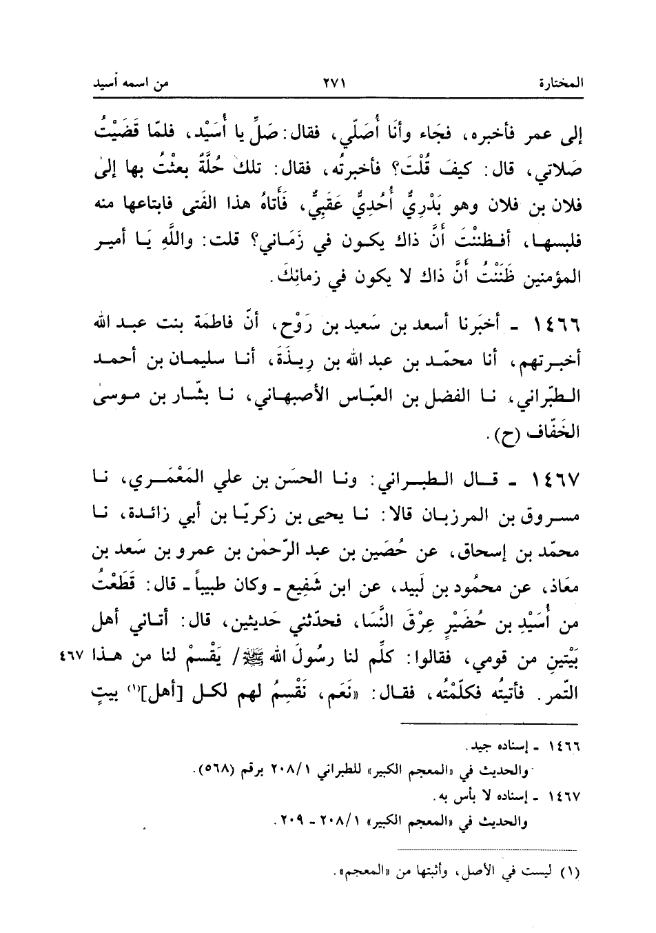 إِلَى عُمَرَ فَأَخْبَرَهُ فَجَاءَ وَأَنَا أُصَلِّي فَقَالَ صَلِّ يَا أُسَيْدُ فَلَمَّا قَضَيْتُ صَلاتِي قَالَ كَيْفَ قُلْتَ فَأخبرتُهُ فَقَالَ تِلْكَ حُلَّةٌ بَعَثْتُ بِهَا إِلَى فُلانِ بن فلَان وهوب دري أُحُدِيٌّ عَقَبِيٌّ فَأَتَاهُ هَذَا الْفَتَى فَابْتَاعَهَا مِنْهُ فَلَبِسَهَا أَفَظَنَنْتَ أَنَّ ذَاكَ يَكُونُ فِي زَمَانِي قُلْتُ وَاللَّهِ يَا أَمِيرَ الْمُؤْمِنِينَ ظَنَنْتُ أَنَّ ذَاك لَا يكون فِي زَمَانك إِسْنَاده جيد