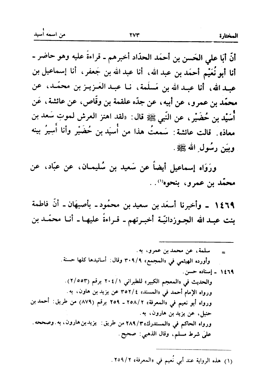 1469 - وَأَخْبَرَنَا أَسْعَدُ بْنُ سَعِيدِ بْنِ مَحْمُودٍ بِأَصْبَهَانَ أَنَّ فَاطِمَةَ بِنْتَ عَبْدِ اللَّهِ الْجَوْزِدَانِيَّةَ أَخْبَرَتْهُمْ قِرَاءَةً عَلَيْهَا أَنا مُحَمَّدُ بْنُ عَبْدِ اللَّهِ بْنِ رِيذَةَ أَنَا سُلَيْمَانُ بْنُ أَحْمَدَ الطَّبَرَانِيُّ نَا عُبَيْدُ بْنُ غَنَّامٍ نَا أَبُو بَكْرِ بْنُ أَبِي شَيْبَةَ نَا يَزِيدُ بْنُ هَارُونَ نَا مُحَمَّدُ بُنْ عَمْرٍو عَنْ أَبِيهِ عَنْ جَدِّهِ عَنْ عَائِشَةَ عَنْ أُسَيْدِ بْنِ حُضَيْرٍ رَضِيَ اللَّهُ عَنْهُ قَالَ قَالَ رَسُولُ اللَّهِ