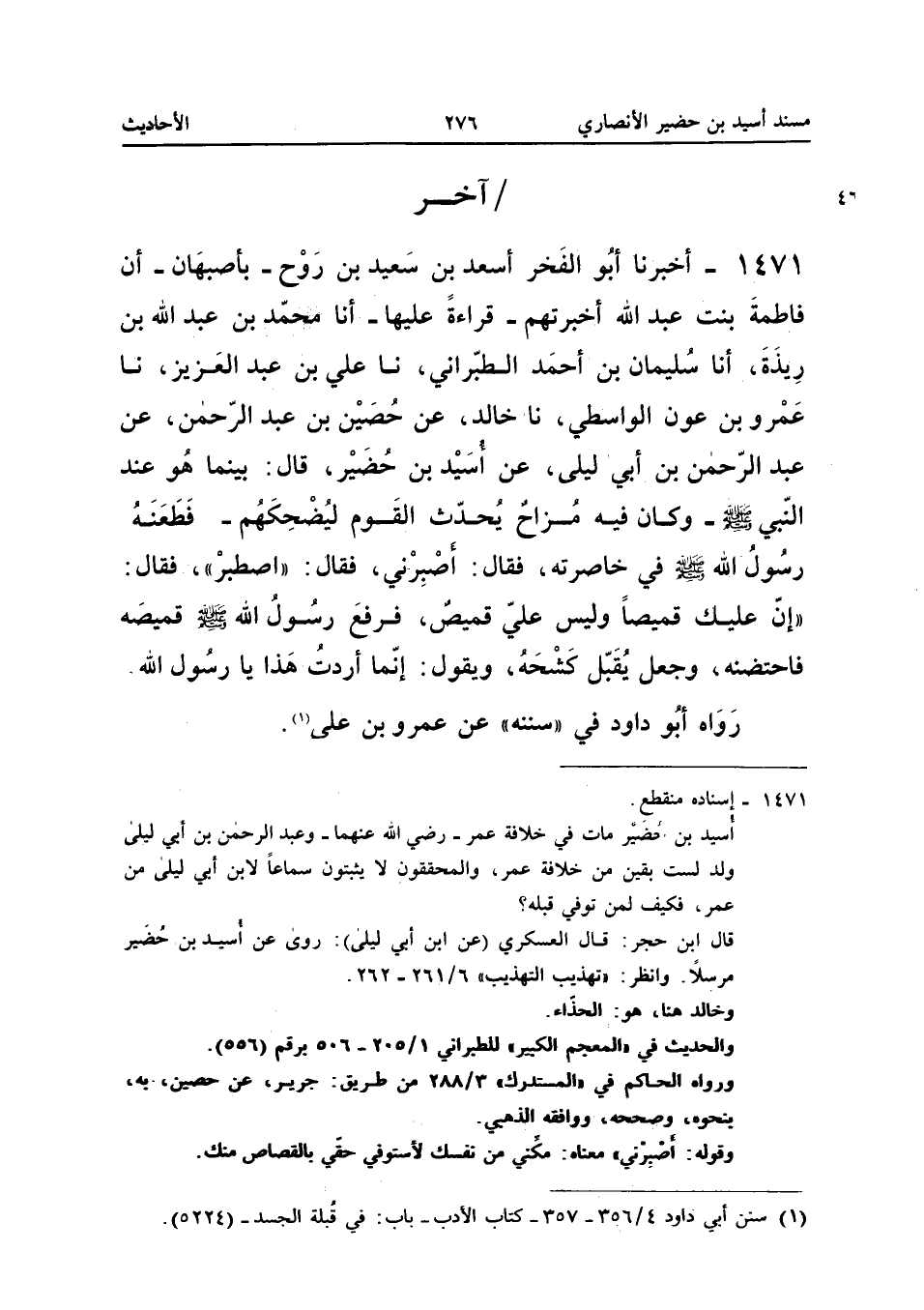 1471 - أَخْبَرَنَا أَبُو الْفَخْرِ أَسْعَدُ بْنُ سَعِيدِ بْنِ رَوْحٍ بِأَصْبَهَانَ أَنَّ فَاطِمَةَ بِنْتَ عَبْدِ اللَّهِ أَخْبَرَتْهُمْ قِرَاءَةً عَلَيْهَا أَنا مُحَمَّدُ بْنُ عَبْدِ اللَّهِ بْنِ رِيذَةَ أَنَا سُلَيْمَانُ بْنُ أَحْمَدَ الطَّبَرَانِيُّ نَا عَلِيُّ بْنُ عَبْدِ الْعَزِيزِ نَا عَمْرُو بْنُ عَوْنٍ الْوَاسِطِيُّ نَا خَالِدٌ عَنْ حُصَيْنِ بْنِ عَبْدِ الرَّحْمَنِ عَنْ عَبْدِ الرَّحْمَنِ بْنِ أَبِي لَيْلَى عَنْ أُسَيْدِ بْنِ حُضَيْرٍ قَالَ بَيْنَمَا هُوَ عِنْدَ النَّبِيِّ صَلَّى اللَّهُ عَلَيْهِ وَسَلَّمَ وَكَانَ فِيهِ مُزَاحٌ يُحَدِّثُ الْقَوْمَ لِيُضْحِكَهُمْ فَطَعَنَهُ رَسُولُ اللَّهِ صَلَّى اللَّهُ عَلَيْهِ وَسَلَّمَ فِي خَاصِرَتِهِ فَقَالَ أَصَبِرْنِي فَقَالَ اصْطَبِرْ فَقَالَ إِنَّ عَلَيْكَ قَمِيصًا وَلَيْسَ عَلَيَّ قَمِيصٌ فَرَفَعَ رَسُولُ اللَّهِ صَلَّى اللَّه عَلَيْهِ وَسَلَّمَ قَمِيصَهُ فَاحْتَضَنَهُ وَجَعَلَ يُقَبِّلُ كَشْحَهُ وَيَقُولُ إِنَّمَا أَرَدْتُ هَذَا يَا رَسُولَ اللَّهِ رَوَاهُ أَبُو دَاوُدَ فِي سُنَنِهِ عَنْ عَمْرِو بْنِ عَلِيٍّ