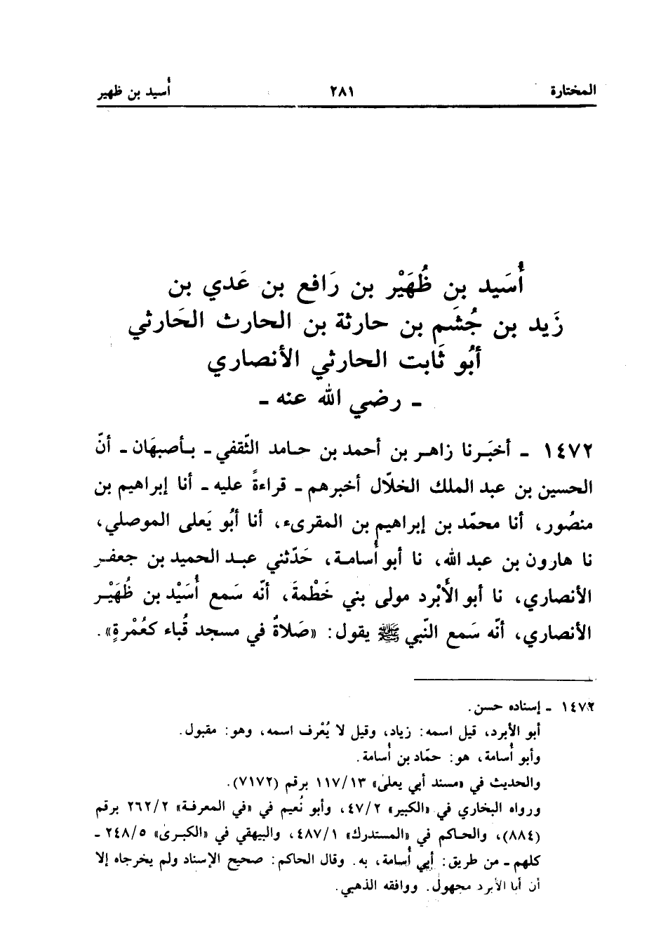 1472 - أَخْبَرَنَا زَاهِرُ بْنُ أَحْمَدَ بْنِ حَامِدٍ الثَّقَفِيُّ بِأَصْبَهَانَ أَنَّ الْحُسَيْنَ بْنَ عَبْدِ الْمَلِكِ الْخَلالَ أَخْبَرَهُمْ قِرَاءَةً عَلَيْهِ أَنا إِبْرَاهِيمُ بْنُ مَنْصُور أَنا مُحَمَّدُ بْنُ إِبْرَاهِيمَ بْنِ الْمُقْرِئِ أَنا أَبُو يَعْلَى الْمَوْصِلِيُّ نَا هَارُونُ بْنُ عَبْدِ اللَّهِ نَا أَبُو أُسَامَةَ حَدَّثَنِي عَبْدُ الْحَمِيدِ بْنُ جَعْفَرٍ الأَنْصَارِيُّ نَا أَبُو الأَبْرَدِ مَوْلَى بَنِي خَطْمَةَ أَنَّهُ سَمِعَ أُسَيْدَ بْنَ ظُهَيْرٍ الأَنْصَارِيَّ أَنَّهُ سَمِعَ النَّبِيَّ صَلَّى اللَّهُ عَلَيْهِ وَسَلَّمَ يَقُول صَلَاة فِي مَسْجِد قبَاء كعمرة