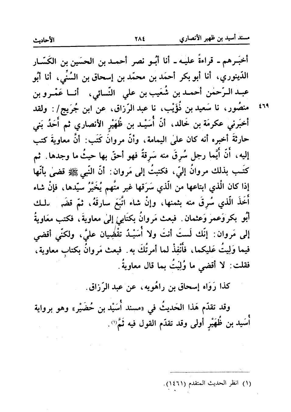 أَخْبَرَهُمْ قِرَاءَةً عَلَيْهِ أَنا أَبُو نَصْرٍ أَحْمَدُ بْنُ الْحُسَيْنِ بْنِ الْكَسَّارِ الدِّينَوَرِيُّ أَنا أَبُو بَكْرٍ أَحْمَدُ بْنُ مُحَمَّدِ بْنِ إِسْحَاقَ بْنِ السُّنِّيِّ أَنا أَبُو عَبْدِ الرَّحْمَنِ أَحْمَدُ بْنُ شُعَيْبِ بْنِ عَلِيٍّ النَّسَائِيُّ أَنا عَمْرُو بْنُ مَنْصُورٍ نَا سَعِيدُ بْنُ ذُؤَيْبٍ نَا عَبْدُ الرَّزَّاقِ عَنِ ابْنِ جُرَيْجٍ وَلَقَدْ أخبرنِي عِكْرِمَةُ بْنُ خَالِدٍ أَنَّ أُسَيْدَ بْنَ ظُهَيْرٍ الأَنْصَارِيَّ ثُمَّ أَحَدَ بَنِي حَارِثَةَ أخبرهُ أَنَّهُ كَانَ عَلَى الْيَمَامَةِ وَأَنَّ مَرْوَانَ كَتَبَ أَنَّ مُعَاوِيَةَ كَتَبَ إِلَيْهِ أَنْ أَيُّمَا رَجُلٍ سُرِقَ مِنْهُ سَرِقَةٌ فَهُوَ أَحَقُّ بِهَا حَيْثُ مَا وَجَدَهَا ثُمَّ كَتَبَ بِذَلِكَ مَرْوَانُ إِلَيَّ فَكَتَبْتُ إِلَى مَرْوَانَ أَنَّ النَّبِيَّ صَلَّى اللَّهُ عَلَيْهِ وَسَلَّمَ قَضَى بِأَنَّهَا إِذَا كَانَ الَّذِي ابْتَاعَهَا مِنَ الَّذِي سَرَقَهَا غَيْرَ مُتَّهَمٍ يُخَيَّرُ سَيِّدُهَا فَإِنْ شَاءَ أَخَذَ الَّذِي سَرَقَ مِنْهُ بِثَمَنِهَا وَإِنْ شَاءَ أُتْبِعَ سَارِقهُ ثُمَّ قَضَى بِذَلِكَ أَبُو بَكْرٍ وَعُمَرُ وَعُثْمَانُ فَبَعَثَ مَرْوَانُ بِكِتَابِي إِلَى مُعَاوِيَةَ فَكَتَبَ مُعَاوِيَةُ إِلَى مَرْوَانَ إِنَّكَ لَسْتَ أَنْتَ وَلا أُسَيْدٌ تَقْضِيَانِ عَلَيَّ وَلَكِنِّي أَقْضِي فِيمَا وُلِّيتُ عَلَيْكُمْا فَانْفُذْ لِمَا أَمَرْتُكَ بِهِ فَبَعَثَ مَرْوَانُ بِكِتَابِ مُعَاوِيَةَ فَقُلْتُ لَا أَقْضِي مَا وُلِّيتُ بِمَا قَالَ مُعَاوِيَةُ كَذَا رَوَاهُ إِسْحَاقُ بْنُ رَاهَوَيْهِ عَنْ عَبْدِ الرَّزَّاقِ وَقَدْ تَقَدَّمَ هَذَا الْحَدِيثُ فِي مُسْنَدِ أُسَيْدِ بْنِ حُضَيْرٍ وَهُوَ بِرِوَايَةِ أُسَيْدِ بْنِ ظُهَيْرٍ أَوْلَى وَقد تقدم القَوْل فِيهِ ثمَّ
