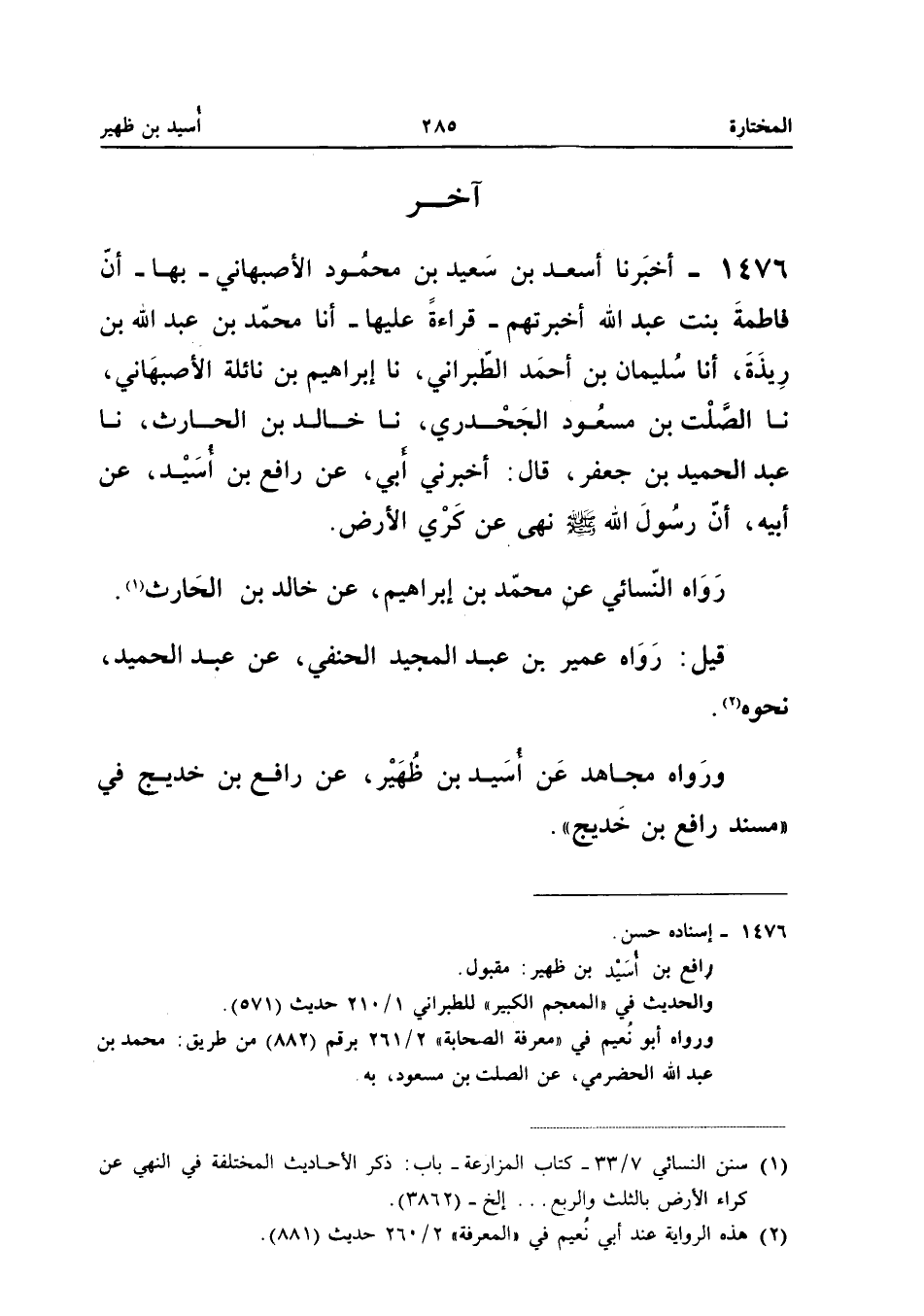 1476 - أَخْبَرَنَا أَسْعَدُ بْنُ سَعِيدِ بْنِ مَحْمُودٍ الأَصْبَهَانِيُّ بِهَا أَنَّ فَاطِمَةَ بِنْتَ عَبْدِ اللَّهِ أَخْبَرَتْهُمْ قِرَاءَةً عَلَيْهَا أَنا مُحَمَّدُ بْنُ عَبْدِ اللَّهِ بْنِ رِيذَةَ أَنَا سُلَيْمَانُ بْنُ أَحْمَدَ الطَّبَرَانِيُّ نَا إِبْرَاهِيمُ بْنُ نَائِلَةَ الأَصْبَهَانِيُّ نَا الصَّلْتُ بْنُ مَسْعُودٍ الْجَحْدَرِيُّ نَا خَالِدُ بْنُ الْحَارِثِ نَا عَبْدُ الْحَمِيدِ بْنُ جَعْفَرٍ قَالَ أخبرنِي أَبِي عَنْ رَافِعِ بْنِ أُسَيْدٍ عَنْ أَبِيهِ إِنَّ رَسُولَ اللَّهِ صَلَّى اللَّهُ عَلَيْهِ وَسَلَّمَ نَهَى عَنْ كَرْيِ الأَرْضِ رَوَاهُ النَّسَائِيُّ عَنْ مُحَمَّدِ بْنِ إِبْرَاهِيمَ عَنْ خَالِدِ بْنِ الْحَارِثِ قِيلَ رَوَاهُ عُمَيْرُ بْنُ عَبْدِ الْمَجِيدِ الْحَنَفِيُّ عَنْ عَبْدِ الْحَمِيدِ نَحْوَهُ وَرَوَاهُ مُجَاهِدٌ عَنْ أُسَيْدِ بْنِ ظُهَيْرٍ عَنْ رَافِعِ بْنِ خَدِيجٍ فِي مُسْنَدِ رَافِعِ بْنِ خَدِيجٍ