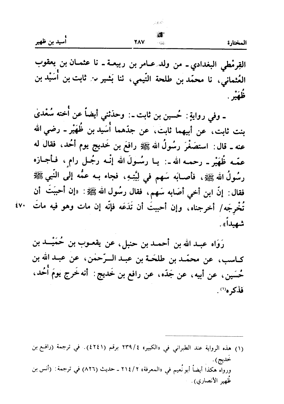 صَلَّى اللَّهُ عَلَيْهِ وَسَلَّمَ رَافِعَ بْنَ خَدِيجٍ يَوْمَ أُحُدٍ فَقَالَ لَهُ عَمُّهُ ظُهَيْرٌ رَحِمَهُ اللَّهُ يَا رَسُولَ اللَّهِ إِنَّهُ رَجُلٌ رِامٍ فَأَجَازَهُ رَسُولُ اللَّهِ صَلَّى اللَّهُ عَلَيْهِ وَسَلَّمَ فَأَصَابَهُ سَهْمٌ فِي لِبَّتِهِ فَجَاءَ بِهِ عَمُّهُ إِلَى النَّبِيِّ صَلَّى اللَّهُ عَلَيْهِ وَسَلَّمَ فَقَالَ إِنَّ ابْنَ أَخِي أَصَابَهُ سَهْمٌ فَقَالَ رَسُولُ اللَّهِ صَلَّى اللَّهُ عَلَيْهِ وَسَلَّمَ إِنْ أَحْبَبْتَ أَنْ تُخْرِجَهُ أَخْرَجْنَاهُ وَإِنْ أَحْبَبْتَ أَنْ تَدَعَهُ فَإِنَّهُ إِنْ مَاتَ وَهُوَ فِيهِ مَاتَ شَهِيدًا رَوَاهُ عَبْدُ اللَّهِ بْنُ أَحْمَدَ بْنِ حَنْبَلٍ عَنْ يَعْقُوبَ بْنِ حُمَيْدِ بْنِ كَاسِبٍ عَنْ مُحَمَّدِ بْنِ طَلْحَةَ بْنِ عَبْدِ الرَّحْمَنِ عَنْ عَبْدِ اللَّهِ بْنِ حُسَيْنٍ عَنْ أَبِيهِ عَنْ جَدِّهِ عَنْ رَافِعِ بْنِ خَدِيجٍ أَنَّهُ خَرَجَ يَوْمَ أُحُدٍ فَذَكَرَهُ