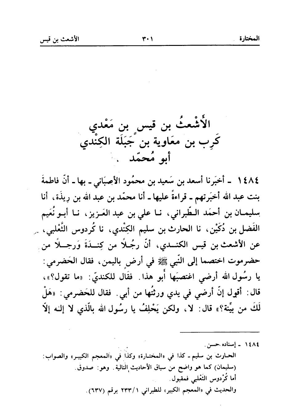 1484 - أَخْبَرَنَا أَسْعَدُ بْنُ سَعِيدِ بْنِ مَحْمُودٍ الأَصْبَهَانِيُّ بِهَا أَنَّ فَاطِمَةَ بِنْتَ عَبْدِ اللَّهِ أَخْبَرَتْهُمْ قِرَاءَةً عَلَيْهَا أَنا مُحَمَّدُ بْنُ عَبْدِ اللَّهِ بْنِ رِيذَةَ أَنَا سُلَيْمَانُ بْنُ أَحْمَدَ الطَّبَرَانِيُّ نَا عَلِيُّ بْنُ عَبْدِ الْعَزِيزِ نَا أَبُو نُعَيْمٍ الْفَضْلُ بْنُ دُكَيْنٍ نَا الْحَارِثُ بْنُ سُلَيْمٍ الْكِنْدِيُّ نَا كُرْدُوسٌ الثَّعْلَبِيُّ عَنِ الأَشْعَثِ بْنِ قَيْسٍ الْكِنْدِيِّ أَنَّ رَجُلا مِنْ كِنْدَةَ وَرَجُلا مِنْ حَضْرَمَوْتَ اخْتَصَمَا إِلَى النَّبِيِّ صَلَّى اللَّهُ عَلَيْهِ وَسَلَّمَ فِي أَرْضٍ بِالْيَمَنِ فَقَالَ الْحَضْرَمِيُّ يَا رَسُولَ اللَّهِ أَرْضِي اغْتَصَبَهَا أَبُو هَذَا فَقَالَ لِلْكِنْدِيِّ مَا تَقُولُ قَالَ أَقُولُ إِنَّ أَرْضِي فِي يَدِي وَرِثْتُهَا مِنْ أَبِي فَقَالَ لِلْحَضْرَمِيِّ هَلْ لَكَ مِنْ بَيِّنَةٍ قَالَ لَا وَلَكِنْ يَحْلِفُ يَا رَسُولَ اللَّهِ بِالَّذِي لَا إِلَهَ إِلا