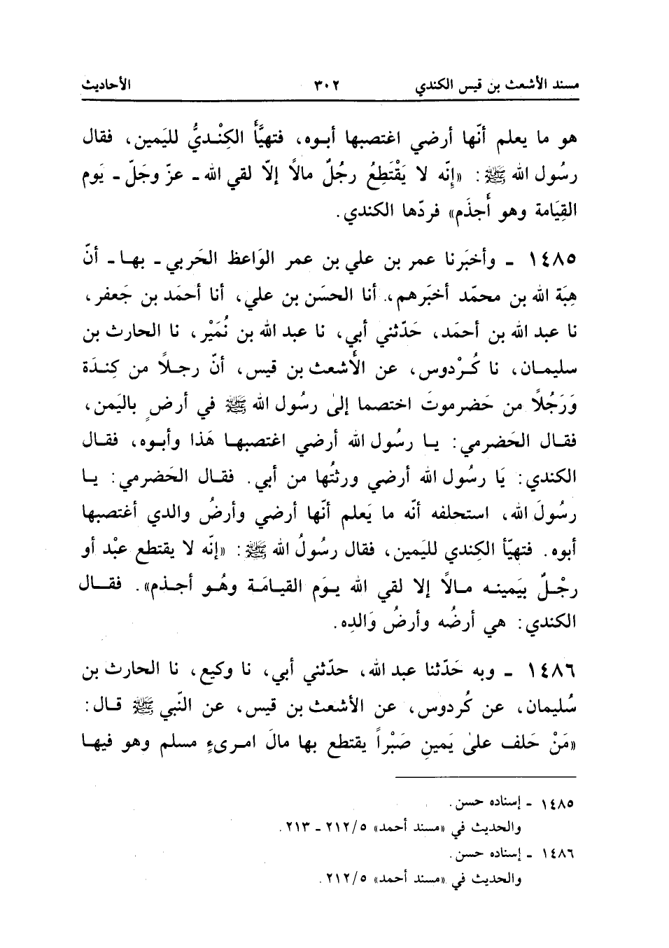 1485 - وَأَخْبَرَنَا عُمَرُ بْنُ عَلِيِّ بْنِ عُمَرَ الْوَاعِظُ الْحَرْبِيُّ بِهَا أَنَّ هِبَةَ اللَّهِ بْنَ مُحَمَّدٍ أَخْبَرَهُمْ أَنا الْحَسَنُ بْنُ عَلِيٍّ أَنا أَحْمَدُ بْنُ جَعْفَرٍ نَا عَبْدُ اللَّهِ بْنُ أَحْمَدَ حَدَّثَنِي أَبِي نَا عَبْدُ اللَّهِ بْنُ نُمَيْرٍ نَا الْحَارِثُ بْنُ سُلَيْمَانَ نَا كُرْدُوسٌ عَنِ الأَشْعَثِ بْنِ قَيْسٍ أَنَّ رَجُلا مِنْ كِنْدَةَ وَرَجُلا مِنْ حَضْرَمَوْتَ اخْتَصَمَا إِلَى رَسُولِ اللَّهِ صَلَّى اللَّهُ عَلَيْهِ وَسَلَّمَ فِي أَرْضٍ بِالْيَمَنِ فَقَالَ الْحَضْرَمِيُّ يَا رَسُولَ اللَّهِ أَرْضِي اغْتَصَبَهَا هَذَا وَأَبُوهُ فَقَالَ الْكِنْدِيُّ يَا رَسُولَ اللَّهِ أَرْضِي وَرِثْتُهَا مِنْ أَبِي فَقَالَ الْحَضْرَمِيُّ يَا رَسُولَ اللَّهِ اسْتَحْلِفْهُ أَنَّهُ مَا يَعْلَمُ أَنَّهَا أَرْضِي وَأَرْضُ وَالِدِي اغْتَصَبَهَا أَبُوهُ فَتَهَيَّأَ الْكِنْدِيُّ لِلْيَمِينِ فَقَالَ رَسُولُ اللَّهِ صَلَّى اللَّهُ عَلَيْهِ وَسَلَّمَ إِنَّهُ لَا يَقْتَطِعُ عَبْدٌ أَوْ رَجُلٌ بِيَمِينِهِ مَالا إِلا لَقِيَ اللَّه يَوْمَ الْقِيَامَةِ وَهُوَ أَجْذَمُ فَقَالَ الْكِنْدِيُّ هِيَ أَرْضُهُ وَأَرْضُ وَالِده إِسْنَاده حسن