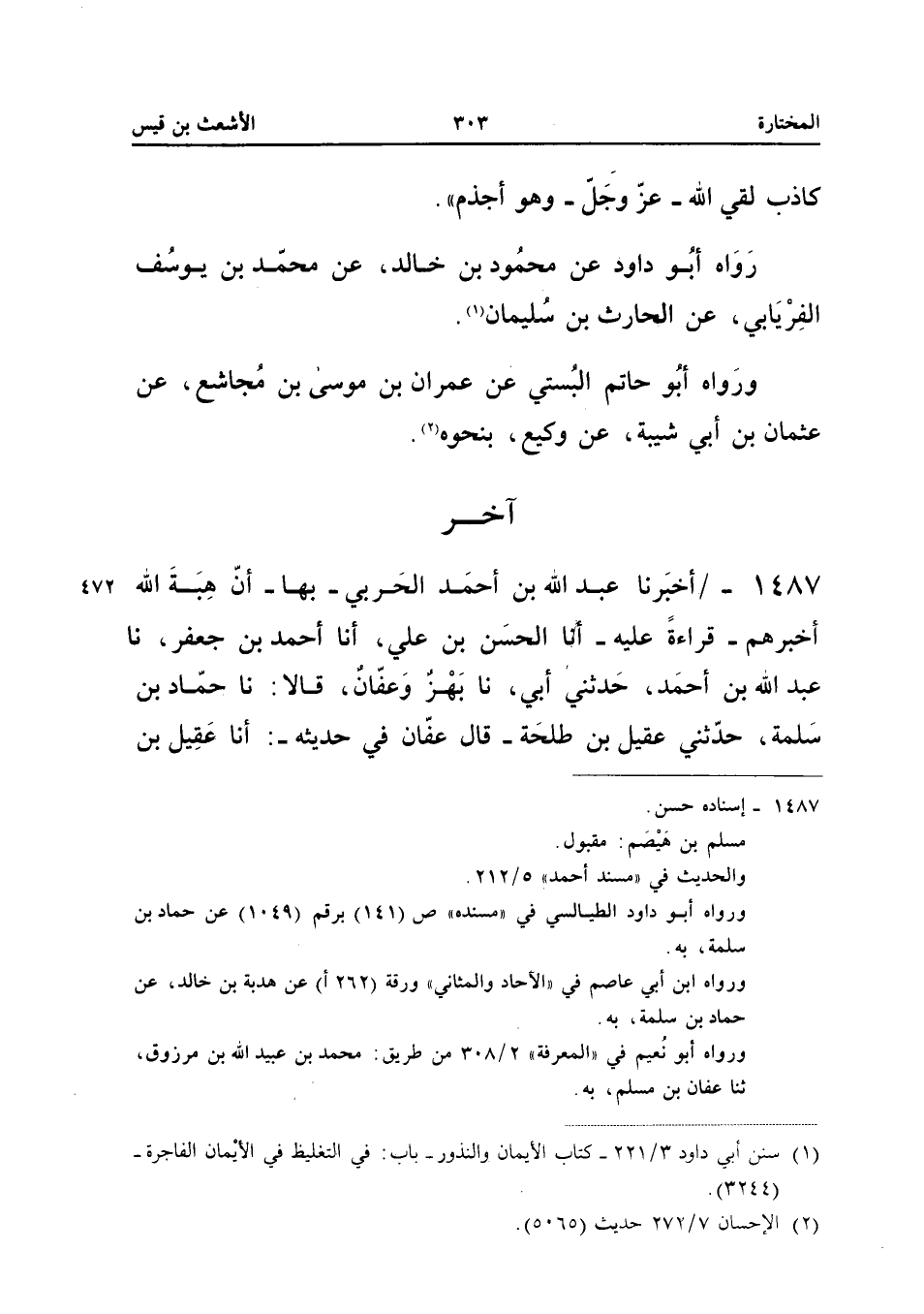 1487 - أَخْبَرَنَا عَبْدُ اللَّهِ بْنُ أَحْمَدَ الْحَرْبِيُّ بِهَا أَنَّ هِبَةَ اللَّهِ أَخْبَرَهُمْ قِرَاءَةً عَلَيْهِ أَنا الْحَسَنُ بْنُ عَلِيٍّ أَنا أَحْمَدُ بْنُ جَعْفَرٍ نَا عَبْدُ اللَّهِ بْنُ أَحْمَدَ حَدَّثَنِي أَبِي نَا بَهْزٌ وَعَفَّانُ قَالا نَا حَمَّادُ بْنُ سَلَمَةَ حَدَّثَنِي عَقِيلُ بْنُ طَلْحَةَ قَالَ عَفَّانُ فِي حَدِيثِهِ أَنا عَقِيلُ بْنُ طَلْحَةَ السُّلَمِيُّ عَنْ مُسْلِمِ بْنِ هَيْصَمٍ عَنِ الأَشْعَثِ بْنِ قَيْسٍ أَنَّهُ قَالَ أَتَيْتُ رَسُولَ اللَّهِ