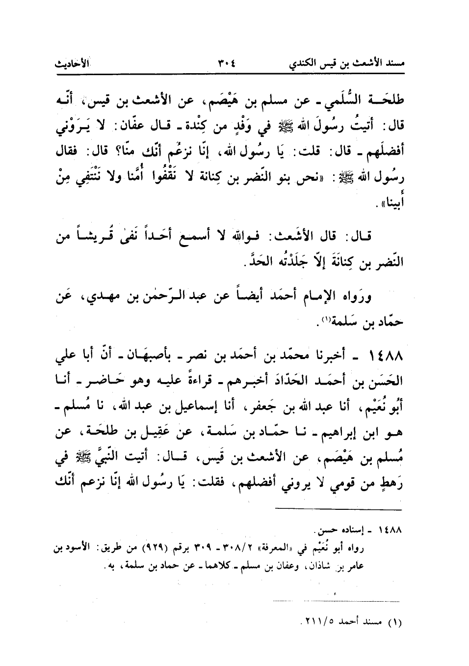 صَلَّى اللَّهُ عَلَيْهِ وَسَلَّمَ فِي وَفْدٍ مِنْ كِنْدَةَ قَالَ عَفَّانُ لَا يَرَوْنِي أَفْضَلَهُمْ قَالَ قُلْتُ يَا رَسُولَ اللَّهِ إِنَّا نَزْعُمُ أَنَّكَ مِنَّا قَالَ فَقَالَ رَسُولُ اللَّهِ صَلَّى اللَّهُ عَلَيْهِ وَسَلَّمَ نَحْنُ بَنُو النَّضْرِ بْنُ كِنَانَةَ لَا نَقْفُوا أُمَّنَا وَلا نَنْتَفِي مِنْ أَبِينَا قَالَ قَالَ الأَشْعَثُ فَوَاللَّهِ لَا أَسْمَعُ أَحَدًا نَفَى قُرَيْشًا مِنَ النَّضْرِ بْنِ كِنَانَةَ إِلا جَلْدُتُه الْحَدَّ وَرَوَاهُ الإِمَامُ أَحْمَدُ أَيْضًا عَنْ عَبْدِ الرَّحْمَنِ بْنِ مَهْدِيٍّ عَنْ حَمَّادِ بْنِ سَلمَة إِسْنَاده حسن