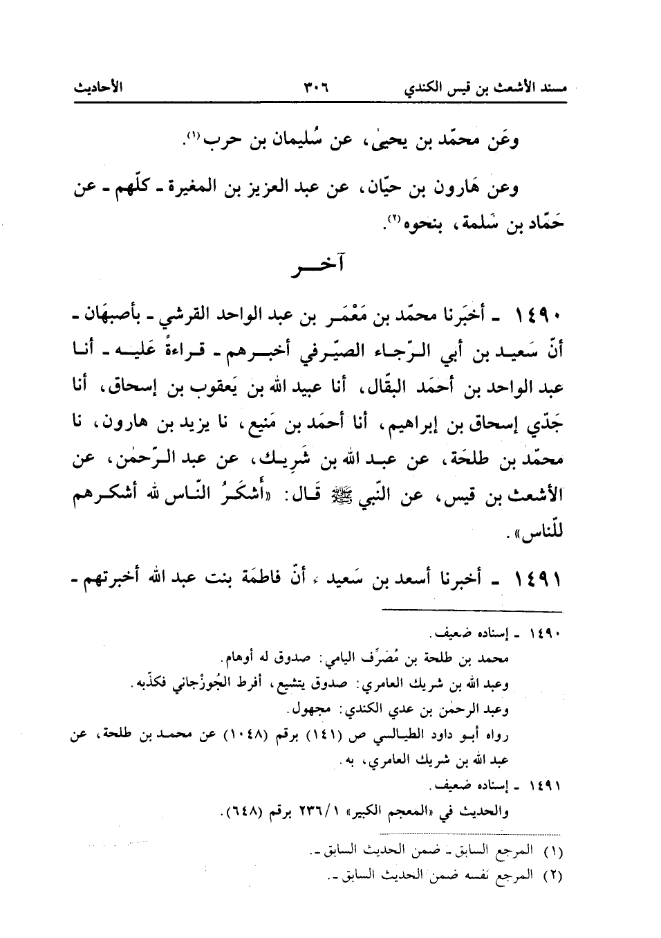 1490 - أَخْبَرَنَا مُحَمَّدُ بْنُ مَعْمَرِ بْنِ عَبْدِ الْوَاحِدِ الْقُرَشِيُّ بِأَصْبَهَانَ أَنَّ سَعِيدَ بْنَ أَبِي الرَّجَاءِ الصَّيْرَفِيَّ أَخْبَرَهُمْ قِرَاءَةً عَلَيْهِ أَنا عَبْدُ الْوَاحِدِ بْنُ أَحْمَدَ الْبَقَّالُ أَنا عُبَيْدُ اللَّهِ بْنُ يَعْقُوبَ بْنِ إِسْحَاقَ أَنا جَدِّي إِسْحَاقُ بْنُ إِبْرَاهِيمَ أَنا أَحْمَدُ بْنُ مَنِيعٍ نَا يَزِيدُ بْنُ هَارُونَ نَا مُحَمَّدُ بْنُ طَلْحَةَ عَنْ عَبْدِ اللَّهِ بْنِ شَرِيكٍ عَنْ عَبْدِ الرَّحْمَنِ عَنِ الأَشْعَثِ بْنِ قَيْسٍ عَنِ النَّبِيِّ صَلَّى اللَّهُ عَلَيْهِ وَسَلَّمَ قَالَ أَشْكَرُ النَّاسِ للَّهِ أشكرهم للنَّاس إِسْنَاده ضَعِيف