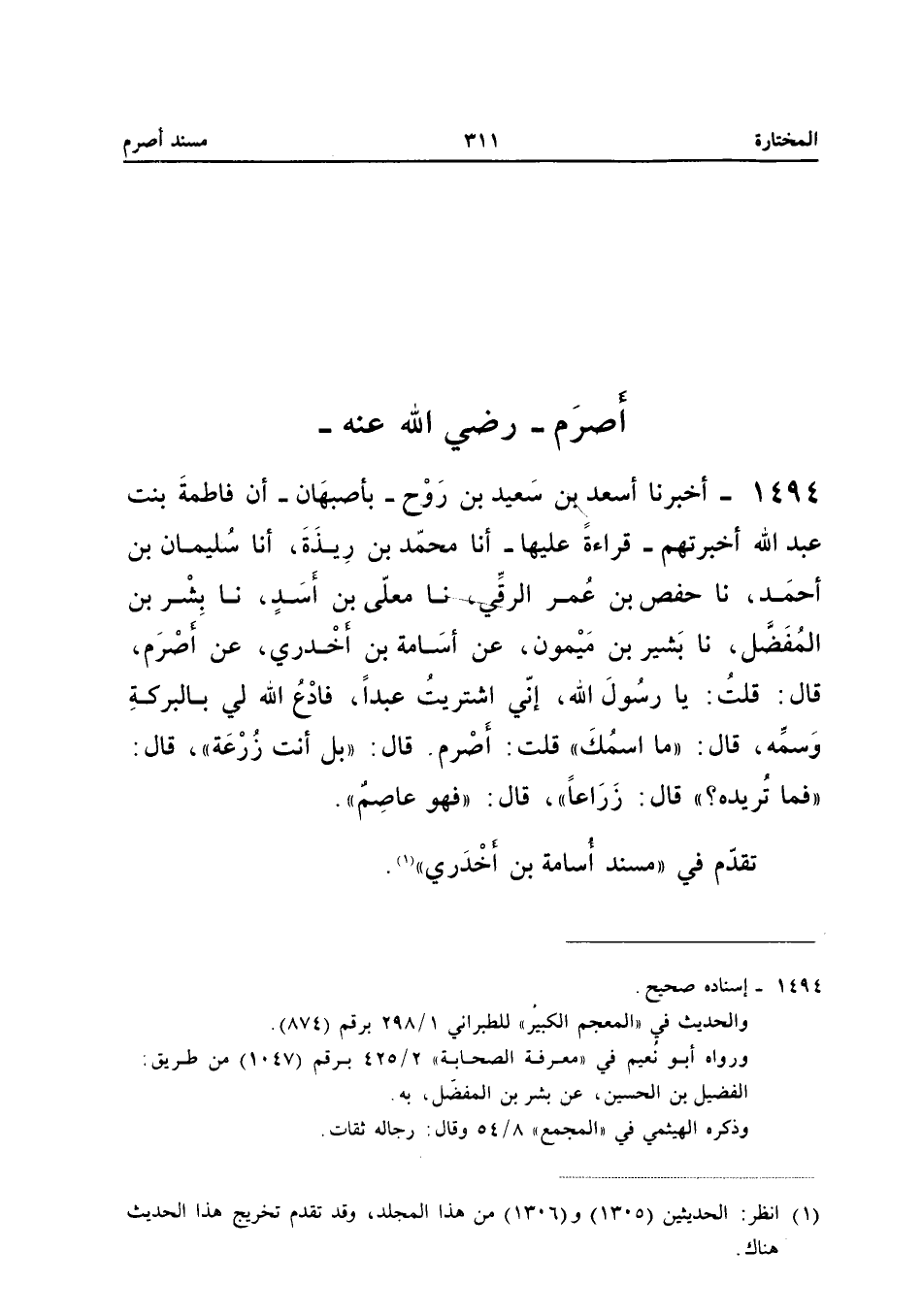 1494 - أَخْبَرَنَا أَسْعَدُ بْنُ سَعِيدِ بْنِ رَوْحٍ بِأَصْبَهَانَ أَنَّ فَاطِمَةَ بِنْتَ عَبْدِ اللَّهِ أَخْبَرَتْهُمْ قِرَاءَةً عَلَيْهَا أَنا مُحَمَّدُ بْنُ رِيذَةَ أَنا سُلَيْمَانُ بْنُ أَحْمَدَ نَا حَفْصُ بْنُ عُمَرَ الرَّقِّيُّ نَا مُعَلَّى بْنُ أَسَدٍ نَا بِشْرُ بْنُ الْمُفَضَّلِ نَا بَشِيرُ بْنُ مَيْمُونٍ عَنْ أُسَامَةَ بْنِ أَخْدَرِيٍّ عَنْ أَصْرَمَ قَالَ قُلْتُ يَا رَسُولَ اللَّهِ إِنِّي اشْتَرَيْتُ عَبْدًا فَادْعُ اللَّهَ لِي بِالْبَرَكَةِ وَسَمِّهِ قَالَ مَا اسْمُكَ قُلْتُ أَصْرَمُ قَالَ بَلْ أَنْتَ زُرْعَةُ قَالَ فَمَا تُرِيدُهُ قَالَ زَرَّاعًا قَالَ فَهُوَ عَاصِمٌ تَقَدَّمَ فِي مُسْنَدِ أُسَامَةَ بْنِ أَخْدَرِيٍّ