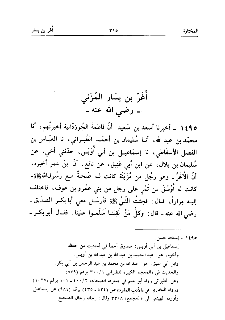 1495 - أَخْبَرَنَا أَسْعَدُ بْنُ سَعِيدٍ أَنَّ فَاطِمَةَ الْجَوْزَدَانِيَّةَ أخبرتْهُمْ أَنا مُحَمَّدُ بْنُ عَبْدِ اللَّهِ أَنا سُلَيْمَانُ بْنُ أَحْمَدَ الطَّبَرَانِيُّ نَا الْعَبَّاسُ بْنُ الْفَضْلِ الأَسْفَاطِيُّ نَا إِسْمَاعِيلُ بْنُ أَبِي أُوَيْسٍ حَدَّثَنِي أَخِي عَنْ سُلَيْمَانَ بْنِ بِلالٍ عَنِ ابْنِ أَبِي عَتِيقٍ عَنْ نَافِعٍ أَنَّ ابْنَ عُمَرَ أخبرهُ أَنَّ الأَغَرَّ وَهُوَ رَجُلٌ مِنْ مُزَيْنَةَ كَانَتْ لَهُ صُحْبَةٌ مَعَ رَسُولِ اللَّهِ صَلَّى اللَّهُ عَلَيْهِ وَسَلَّمَ كَانَتْ لَهُ أَوْسُقٌ مِنْ تَمْرٍ عَلَى رَجُلٍ مِنْ بَنِي عَمْرِو بْنِ عَوْفٍ فَاخْتَلَفَ إِلَيْهِ مِرَارًا قَالَ فَجِئْتُ النَّبِيَّ صَلَّى اللَّهُ عَلَيْهِ وَسَلَّمَ فَأَرْسَلَ مَعِي أَبَا بَكْرٍ الصِّدِّيقَ رَضِيَ اللَّهُ عَنْهُ قَالَ وَكُلُّ مَنْ لَقِينَا سَلَّمُوا عَلَيْنَا فَقَالَ أَبُو بكر