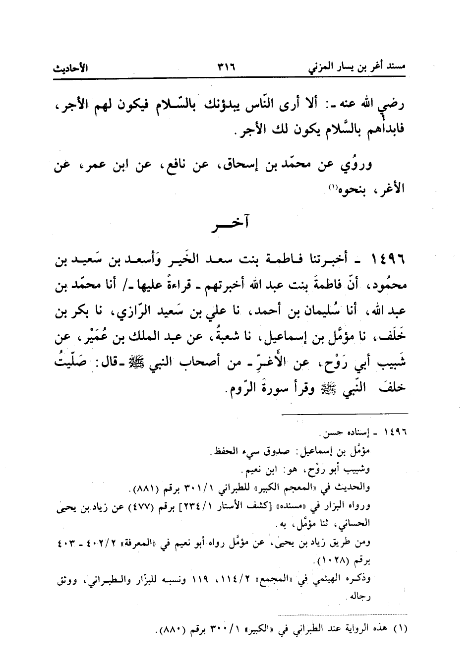 رَضِيَ اللَّهُ عَنْهُ أَلا أرى النَّاس يبدؤنك بِالسَّلامِ فَيَكُونُ لَهُمُ الأَجْرُ فَابْدَأْهُمْ بِالسَّلامِ يَكُونُ لَكَ الأَجْرُ وَرُوِيَ عَنْ مُحَمَّدِ بْنِ إِسْحَاقَ عَن نَافِع عَن ابْن عمر الرَّحْمَن عَن الْأَغَر بِنَحْوِهِ