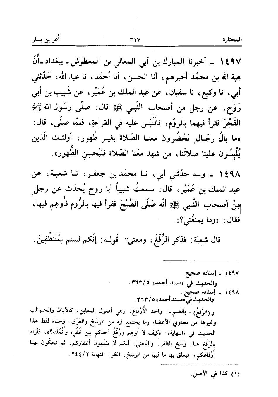 1497 - أَخْبَرَنَا الْمُبَارَكُ بْنُ أَبِي الْمَعَالِي بْنِ الْمَعْطُوشِ بِبَغْدَادَ أَنَّ هِبَةَ اللَّهِ بْنَ مُحَمَّدٍ أَخْبَرَهُمْ أَنا الْحَسَنُ أَنا أَحْمَدُ نَا عَبْدُ اللَّهِ حَدثنِي أبي نَا وَكِيع نَاس سُفْيَانُ عَنْ عَبْدِ الْمَلِكِ بْنِ عُمَيْرٍ عَنْ شَبِيبِ بْنِ أَبِي رَوْحٍ عَنْ رَجُلٍ مِنْ أَصْحَابِ النَّبِيِّ صَلَّى اللَّهُ عَلَيْهِ وَسَلَّمَ قَالَ صَلَّى رَسُولُ اللَّهِ صَلَّى اللَّهُ عَلَيْهِ وَسَلَّمَ الْفَجْرَ فَقَرَأَ فِيهِمَا بِالرُّومِ فَالْتَبَسَ عَلَيْهِ فِي الْقِرَاءَةِ فَلَمَّا صَلَّى قَالَ مَا بَالُ رِجَالٍ يَحْضُرُونَ مَعَنَا الصَّلاةَ بِغَيْرِ طُهُورٍ أُولَئِكَ الَّذِينَ يُلْبِسُونَ عَلَيْنَا صَلاتَنَا مَنْ شَهِدَ مَعَنَا الصَّلاةَ فليحسن الطّهُور إِسْنَاده صَحِيح