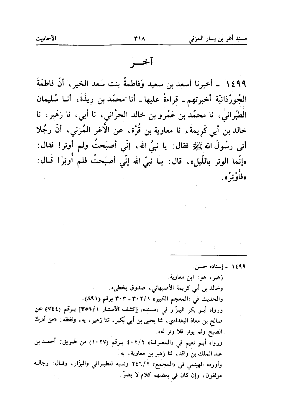 1499 - أَخْبَرَنَا أَسْعَدُ بْنُ سَعِيدٍ وَفَاطِمَةُ بِنْتُ سَعْدِ الْخَيْر أَن فَاطِمَة الجورذانية أخبرتْهُمْ قِرَاءَةً عَلَيْهَا أَنا مُحَمَّدُ بْنُ رِيذَةَ أَنا سُلَيْمَانُ الطَّبَرَانِيُّ نَا مُحَمَّدُ بْنُ عَمْرِو بْنِ خَالِدٍ الْحَرَّانِيُّ نَا أَبِي نَا زُهَيْرٌ نَا خَالِدُ بْنُ أَبِي كَرِيمَةَ نَا مُعَاوِيَةُ بْنُ قُرَّةَ عَنِ الأَغَرِّ الْمُزْنِيِّ أَنَّ رَجُلا أُتِيَ رَسُولُ اللَّهِ صَلَّى اللَّهُ عَلَيْهِ وَسَلْمَ فَقَالَ يَا نَبِيَّ اللَّهِ إِنِّي أَصْبَحْتُ وَلَمْ أُوتِرْ فَقَالَ إِنَّمَا الْوِتْرُ بِاللَّيْلِ قَالَ يَا نَبِيَّ اللَّهِ إِنِّي أَصْبَحْتُ فَلَمْ أُوتِرْ قَالَ فأوتر