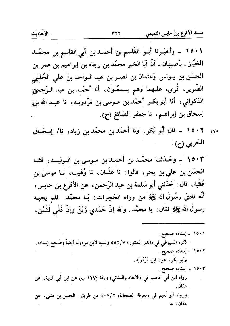1503 - وَحدثنا مُحَمَّدُ بْنُ أَحْمَدَ بْنِ مُوسَى بْنِ الْوَلِيدِ قثنا الْحَسَنُ بْنُ عَلِيِّ بْنِ بَحْرٍ قَالُوا نَا عَفَّانُ نَا وُهَيْبٌ نَا مُوسَى بْنُ عُقْبَةَ قَالَ حَدَّثَنِي أَبُو سَلَمَةَ بْنُ عَبْدِ الرَّحْمَنِ عَنِ الأَقْرَعِ بْنِ حَابِسٍ أَنَّهُ نَادَى رَسُولَ اللَّهِ صَلَّى اللَّهُ عَلَيْهِ وَسَلَّمَ مِنْ وَرَاءِ الْحُجُرَاتِ يَا مُحَمَّدُ فَلَمْ يُجِبْهُ رَسُولِ اللَّهِ صَلَّى اللَّهُ عَلَيْهِ وَسَلَّمَ فَقَالَ يَا مُحَمَّدُ وَاللَّهِ إِنَّ حَمْدِي زَيْنٌ وَإِنَّ ذمِّي لشين