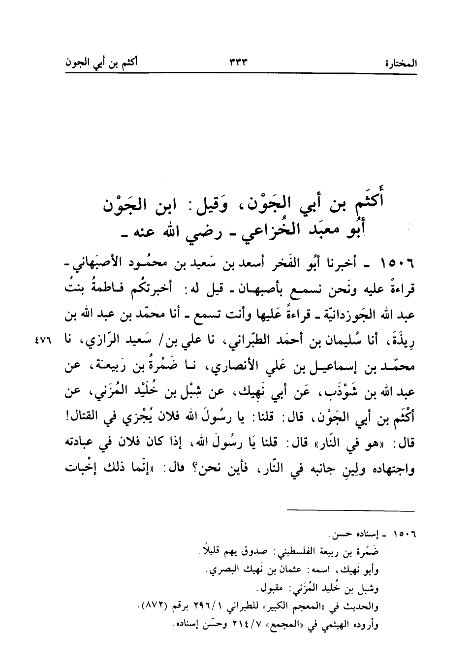 1506 - أَخْبَرَنَا أَبُو الْفَخْرِ أَسْعَدُ بْنُ سَعِيدِ بْنِ مَحْمُودٍ الأَصْبَهَانِيُّ قِرَاءَةً عَلَيْهِ وَنَحْنُ نَسْمَعُ بِأَصْبَهَانَ قِيلَ لَهُ أَخْبَرَتْكُمْ فَاطِمَةُ بِنْتُ عَبْدِ اللَّهِ الْجَوْزِدَانِيَّةُ قِرَاءَةً عَلَيْهَا وَأَنْتَ تَسْمَعُ أَنا مُحَمَّدُ بْنُ عَبْدِ اللَّهِ بْنِ رِيذَةَ أَنَا سُلَيْمَانُ بْنُ أَحْمَدَ الطَّبَرَانِيُّ نَا عَلِيُّ بْنُ سَعِيدٍ الرَّازِيُّ نَا مُحَمَّدُ بْنُ إِسْمَاعِيلَ بْنِ عَلِيٍّ الأَنْصَارِيُّ نَا ضَمْرَةُ بْنُ رَبِيعَةَ عَنْ عَبْدِ اللَّهِ بْنِ شَوْذَبٍ عَنْ أَبِي نَهِيكٍ عَنْ شِبْلِ بِنْ خُلَيْدٍ الْمُزْنِيِّ عَنْ أَكْثَمَ بْنِ أَبِي الْجَوْنِ قَالَ قُلْنَا يَا رَسُولَ اللَّهِ فُلانٌ يُجْزِي فِي الْقِتَالِ قَالَ هُوَ فِي النَّارِ قَالَ قُلْنَا يَا رَسُولَ اللَّهِ إِذَا كَانَ فُلانٌ فِي عِبَادَتِهِ وَاجْتِهَادِهِ وَلِينِ جَانِبِهِ فِي النَّارِ فَأَيْنَ نَحْنُ قَالَ إِنَّمَا ذَلِكَ إخبات