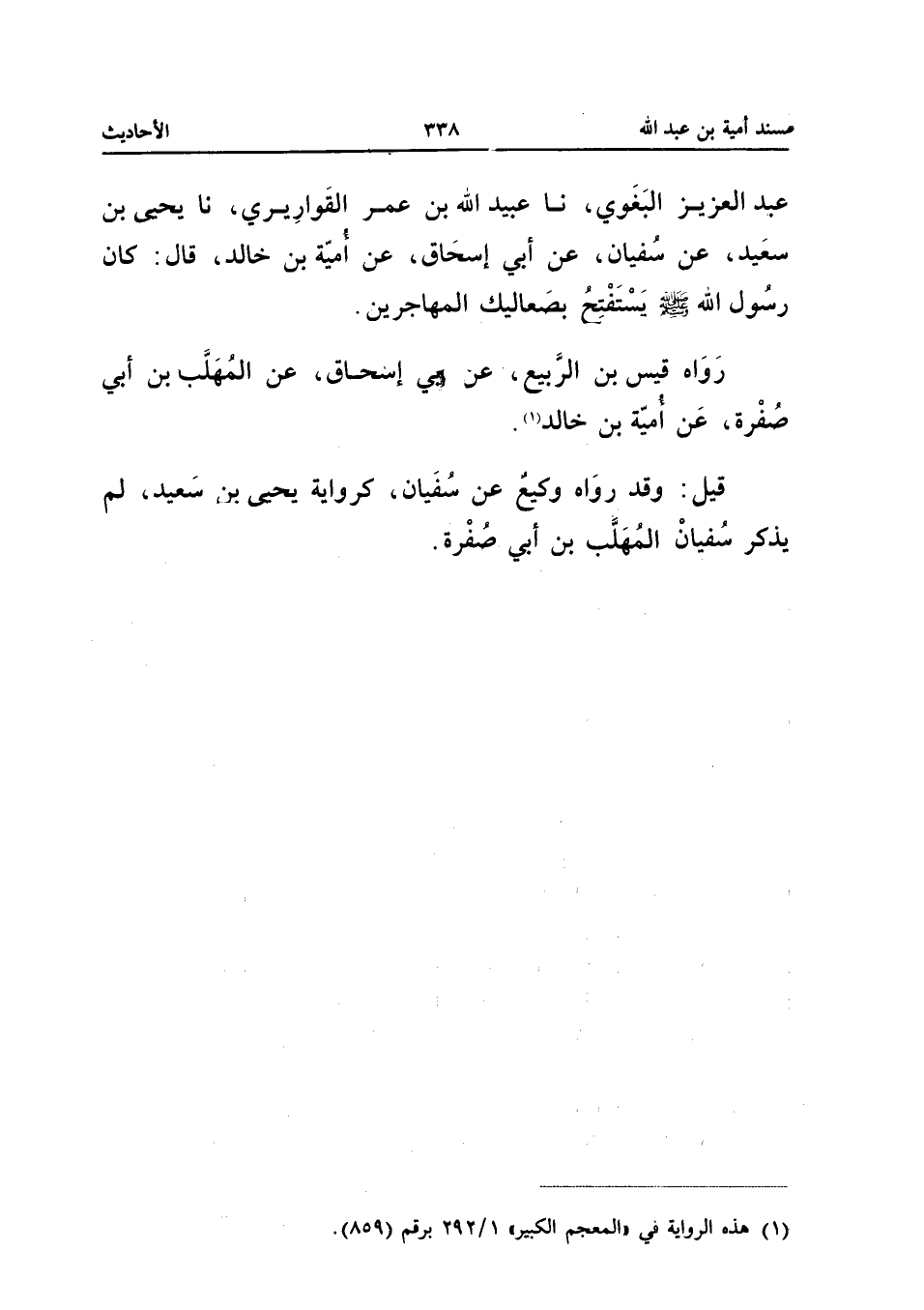 صَلَّى اللَّهُ عَلَيْهِ وَسَلَّمَ يَسْتَفْتِحُ بِصَعَالِيكِ الْمُهَاجِرِينَ رَوَاهُ قَيْسُ بْنُ الرَّبِيعِ عَنْ أَبِي إِسْحَاقَ عَنِ الْمُهَلَّبِ بْنِ أَبِي صُفْرَةَ عَنْ أُمَيَّةَ بِنْ خَالِدٍ (1) قِيلَ وَقَدْ رَوَاهُ وَكِيعٌ عَنْ سُفْيَانَ كَرِوَايَةِ يَحْيَى بْنِ سَعِيدٍ لَمْ يَذْكُرْ سُفْيَانُ الْمُهَلَّبَ بْنَ أَبِي صُفْرَةَ
