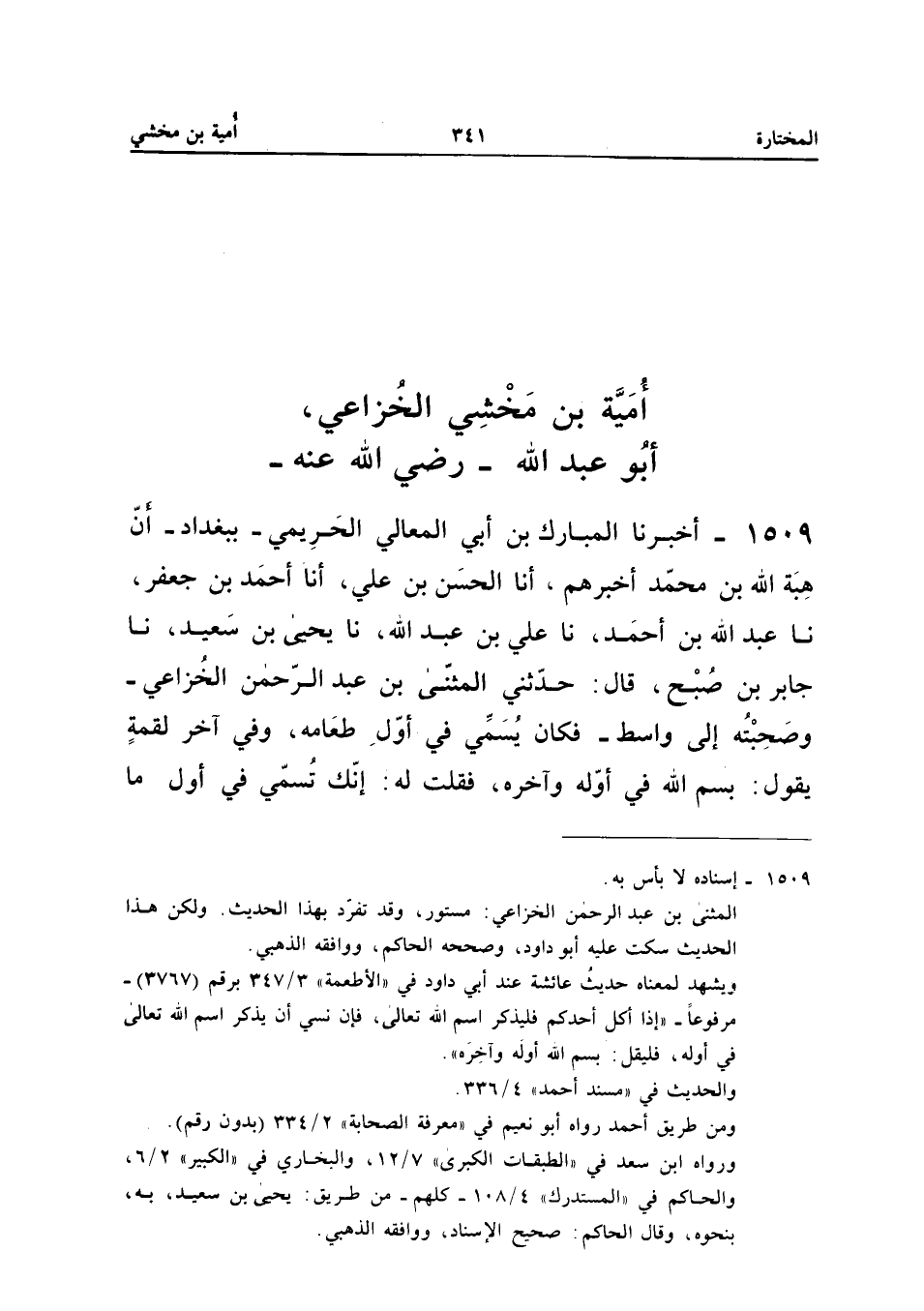 1509 - أَخْبَرَنَا الْمُبَارَكُ بْنُ أَبِي الْمَعَالِي الْحَرِيمِيُّ بِبَغْدَادَ أَنَّ هِبَةَ اللَّهِ بْنَ مُحَمَّدٍ أَخْبَرَهُمْ أَنَا الْحَسَنُ بْنُ عَلِيٍّ أَنا أَحْمَدُ بْنُ جَعْفَرٍ نَا عَبْدُ اللَّهِ بْنُ أَحْمَدَ نَا عَلِيُّ بْنُ عَبْدِ اللَّهِ نَا يَحْيَى بْنُ سَعِيدٍ نَا جَابِرُ بْنُ صُبْحٍ قَالَ حَدَّثَنِي الْمُثَنَّى بْنُ عَبْدِ الرَّحْمَنِ الْخُزَاعِيُّ وَصَحِبْتُهُ إِلَى وَاسِطَ فَكَانَ يُسَمِّي فِي أَوَّلِ طَعَامِهِ وَفِي آخِرِ لُقْمَةٍ يَقُولُ بِسْمِ اللَّهِ فِي أَوَّلِهِ وَآخِرِهِ فَقُلْتُ لَهُ إِنَّكَ تُسَمِّي فِي أَوَّلِ مَا تَأْكُلُ أَرَأَيْتَ قَوْلَكَ فِي آخِرِ مَا تَأْكُلُ بِسْمِ اللَّهِ أَوَّلَهُ وَآخِرَهُ قَالَ أخبركَ عَنْ ذَلِكَ إِنَّ جَدِّي أُمَيَّةَ بْنَ مَخْشِيٍّ وَكَانَ مِنْ أَصْحَابِ النَّبِيِّ