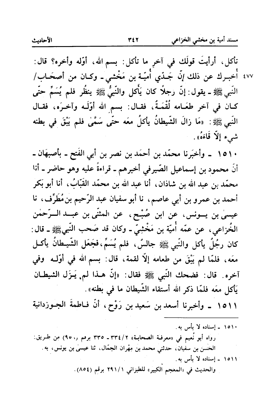 1510 - وَأَخْبَرَنَا مُحَمَّدُ بْنُ أَحْمَدَ بْنِ نَصْرِ بْنِ أَبِي الْفَتْحِ بِأَصْبَهَانَ أَنَّ مَحْمُودَ بْنَ إِسْمَاعِيلَ الصَّيْرَفِيَّ أَخْبَرَهُمْ قِرَاءَةً عَلَيْهِ وَهُوَ حَاضِرٌ أَنَا مُحَمَّدُ بْنُ عَبْدِ اللَّهِ بْنِ شَاذَانَ أَنا عَبْدُ اللَّهِ بْنُ مُحَمَّدٍ الْقَبَّابُ أَنا أَبُو بَكْرٍ أَحْمَدُ بْنُ عَمْرِو بْنِ أَبِي عَاصِمٍ نَا أَبُو سُفْيَانَ عَبْدُ الرَّحِيمِ بْنُ مُطَرِّفٍ نَا عِيسَى بْنُ يُونُسَ عَنِ ابْنِ صُبْحٍ عَنِ الْمُثَنَّى بْنِ عَبْدِ الرَّحْمَنِ الْخُزَاعِيِّ عَنْ عَمِّهِ أُمَيَّةَ بْنِ مَخْشِيٍّ وَكَانَ قَدْ صَحِبَ النَّبِيَّ صَلَّى اللَّهُ عَلَيْهِ وَسَلَّمَ قَالَ كَانَ رَجُلٌ يَأْكُلُ وَالنَّبِيُّ صَلَّى اللَّهُ عَلَيْهِ وَسَلَّمَ جَالِسٌ فَلَمْ يُسَمِّ فَجَعَلَ الشَّيْطَانُ يَأْكُلُ مَعَهُ فَلَمَّا لَمْ يَبْقَ مِنْ طَعَامِهِ إِلا لُقْمَةٌ قَالَ بِسْمِ اللَّهِ فِي أَوَّلِهِ وَفِي آخِرِهِ قَالَ فَضَحِكَ النَّبِيُّ صَلَّى اللَّهُ عَلَيْهِ وَسَلَّمَ فَقَالَ إِنَّ هَذَا لَمْ يَزَلِ الشَّيْطَانُ يَأْكُلُ مَعَهُ فَلَمَّا ذَكَرَ اللَّهَ اسْتَقَاءَ الشَّيْطَانُ مَا فِي بَطْنه إِسْنَاده لَا بَأْس بِهِ