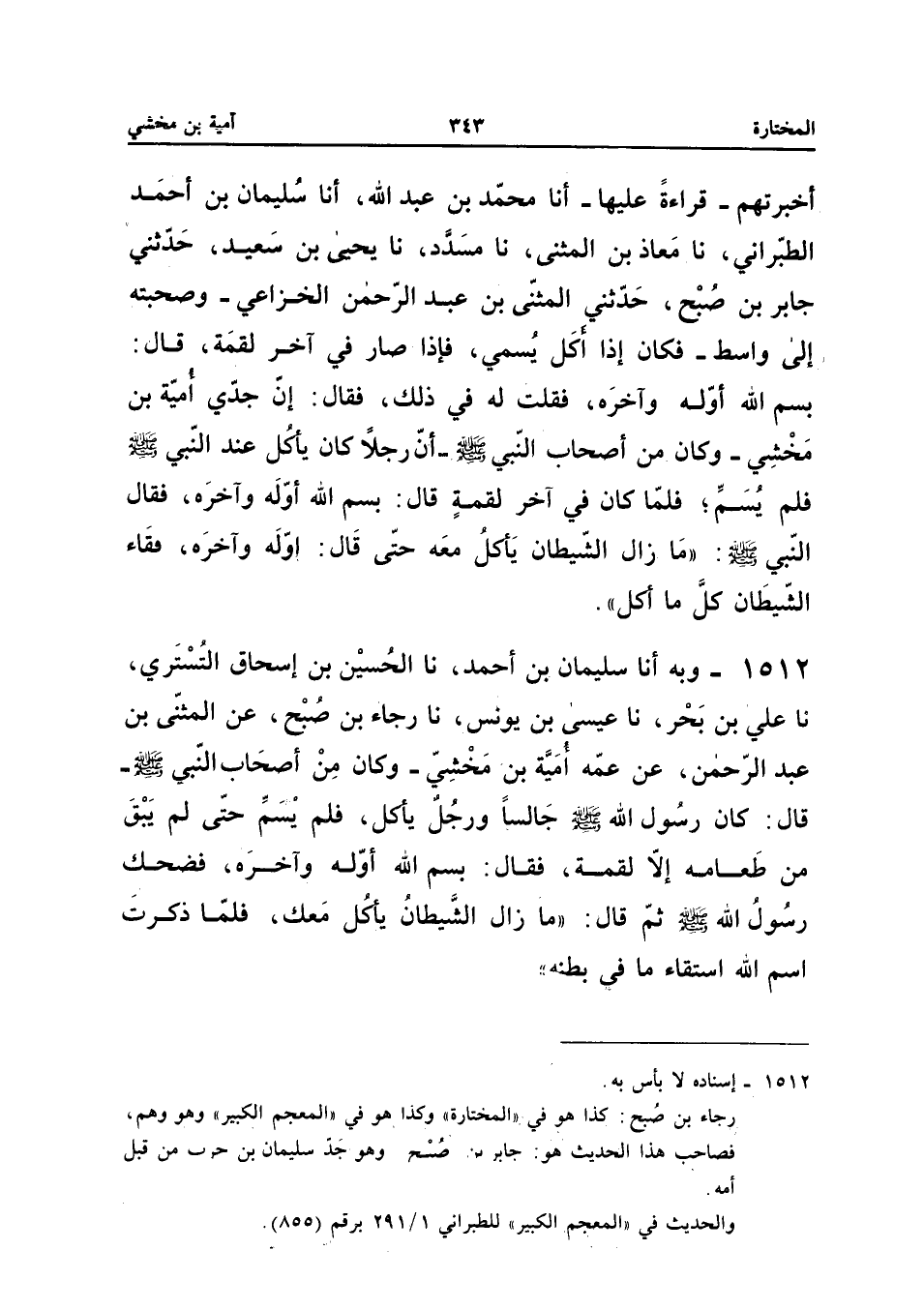 1512 - وَبِهِ أَنا سُلَيْمَانُ بْنُ أَحْمَدَ نَا الْحُسَيْنُ بْنُ إِسْحَاقَ التُّسْتَرِيُّ نَا عَلِيُّ بْنُ بَحْرٍ نَا عِيسَى بْنُ يُونُسَ نَا رَجَاءُ بْنُ صُبْحٍ عَنِ الْمُثَنَّى بْنِ عَبْدِ الرَّحْمَنِ عَنْ عَمِّهِ أُمَيَّةَ بْنِ مَخْشِيٍّ وَكَانَ مِنْ أَصْحَابِ النَّبِيَّ صَلَّى اللَّهُ عَلَيْهِ وَسَلَّمَ قَالَ كَانَ رَسُولُ اللَّهِ صَلَّى اللَّهُ عَلَيْهِ وَسَلَّمَ جَالِسًا وَرَجُلٌ يَأْكُلُ فَلَمْ يُسَمِّ حَتَّى لَمْ يَبْقَ مِنْ طَعَامِهِ إِلا لُقْمَةٌ فَقَالَ بِسْمِ اللَّهِ أَوَّلَهُ وَآخِرَهُ فَضَحِكَ رَسُولُ اللَّهِ صَلَّى اللَّهُ عَلَيْهِ وَسَلَّمَ ثُمَّ قَالَ مَا زَالَ الشَّيْطَانُ يَأْكُلُ مَعَكَ فَلَمَّا ذَكَرْتَ اسْمَ اللَّهِ اسْتَقَاءَ مَا فِي بَطْنِهِ