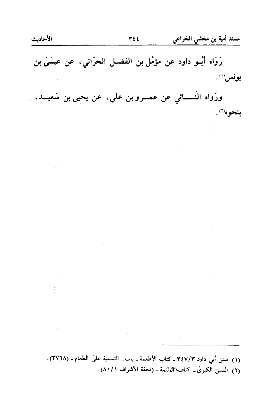 رَوَاهُ أَبُو دَاوُدَ عَنْ مُؤَمَّلِ بْنِ الْفَضْلِ الْحَرَّانِيِّ عَنْ عِيسَى بْنِ يُونُسَ وَرَوَاهُ النَّسَائِيُّ عَنْ عَمْرِو بْنِ عَلِيٍّ عَنْ يَحْيَى بْنِ سَعِيدٍ بِنَحْوِهِ