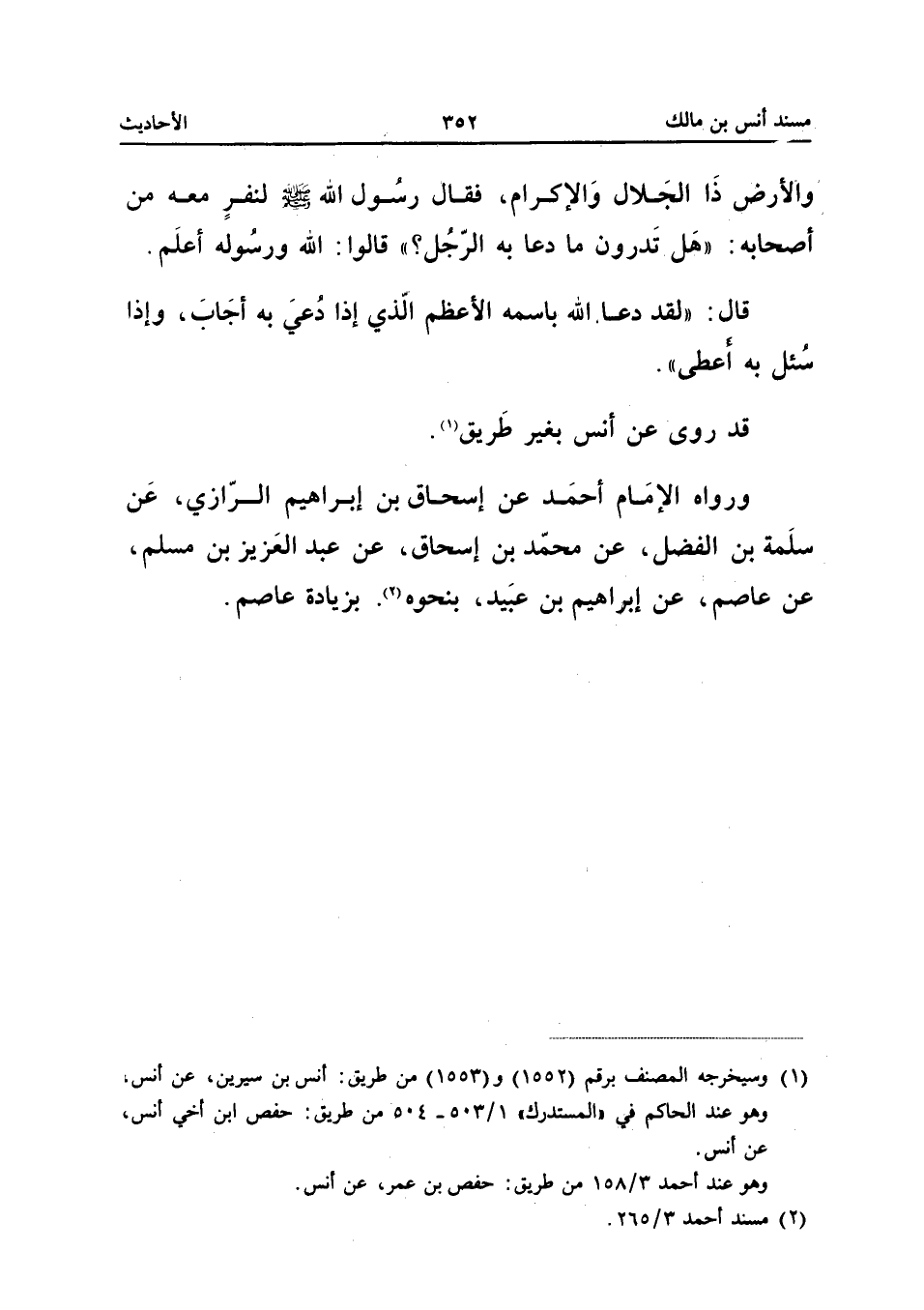 وَالأَرْضِ ذَا الْجَلالِ وَالإِكْرَامِ فَقَالَ رَسُولُ اللَّهِ صَلَّى اللَّهُ عَلَيْهِ وَسَلَّمَ لِنَفَرٍ مَعَهُ مِنْ أَصْحَابِهِ هَلْ تَدْرُونَ مَا دَعَا بِهِ الرَّجُلُ قَالُوا اللَّهُ وَرَسُولُهُ أَعْلَمُ قَالَ لَقَدْ دَعَا اللَّهَ بِاسْمِهِ الأَعْظَمِ الَّذِي إِذَا دُعِيَ بِهِ أَجَابَ وَإِذَا سُئِلَ بِهِ أَعْطَى قَدْ رُوِيَ عَنْ أَنَسٍ بِغَيْرِ طَرِيقٍ وَرَوَاهُ الإِمَامُ أَحْمَدُ عَنْ إِسْحَاقَ بْنِ إِبْرَاهِيمَ الرَّازِيِّ عَنْ سَلَمَةَ بْنِ الْفَضْلِ عَنْ مُحَمَّدِ بْنِ إِسْحَاقَ عَنْ عَبْدِ الْعَزِيزِ بْنِ مُسْلِمٍ عَنْ عَاصِمٍ عَنْ إِبْرَاهِيمَ بْنِ عُبَيْدٍ بِنَحْوِهِ بِزِيَادَةِ عَاصِمٍ