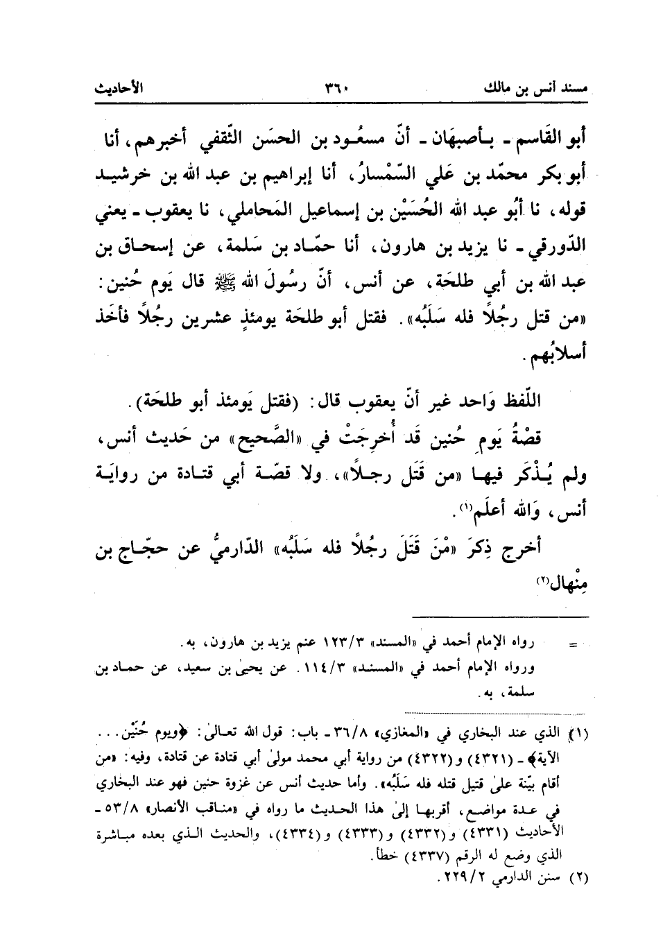 صَلَّى اللَّهُ عَلَيْهِ وَسَلَّمَ قَالَ يَوْمَ حُنَيْنٍ مَنْ قَتَلَ رَجُلا فَلَهُ سَلَبُهُ فَقَتَلَ أَبُو طَلْحَةَ يَوْمَئِذٍ عِشْرِينَ رَجُلا فَأَخَذَ أَسْلابَهُمْ اللَّفْظُ وَاحِدٌ غَيْرَ أَنَّ يَعْقُوبَ قَالَ (فَقَتَلَ يَؤْمَئِذٍ أَبُو طَلْحَةَ) قِصَّةُ يَوْمَ حُنَيْنٍ قَدْ أُخْرِجَتْ فِي الصَّحِيحِ مِنْ حَدِيثِ أَنَسٍ وَلَمْ يَذْكُرْ فِيهَا مَنْ قَتَلَ رَجُلا وَلا قِصَّةَ أَبِي قَتَادَةَ مِنْ رِوَايَةِ أَنَسٍ وَاللَّهُ أَعْلَمُ أَخْرَجَ ذِكْرَ مَنْ قَتَلَ رَجُلا فَلَهُ سَلَبُهُ الدَّارِمِيُّ عَنْ حَجَّاجِ بْنِ مِنْهَالٍ