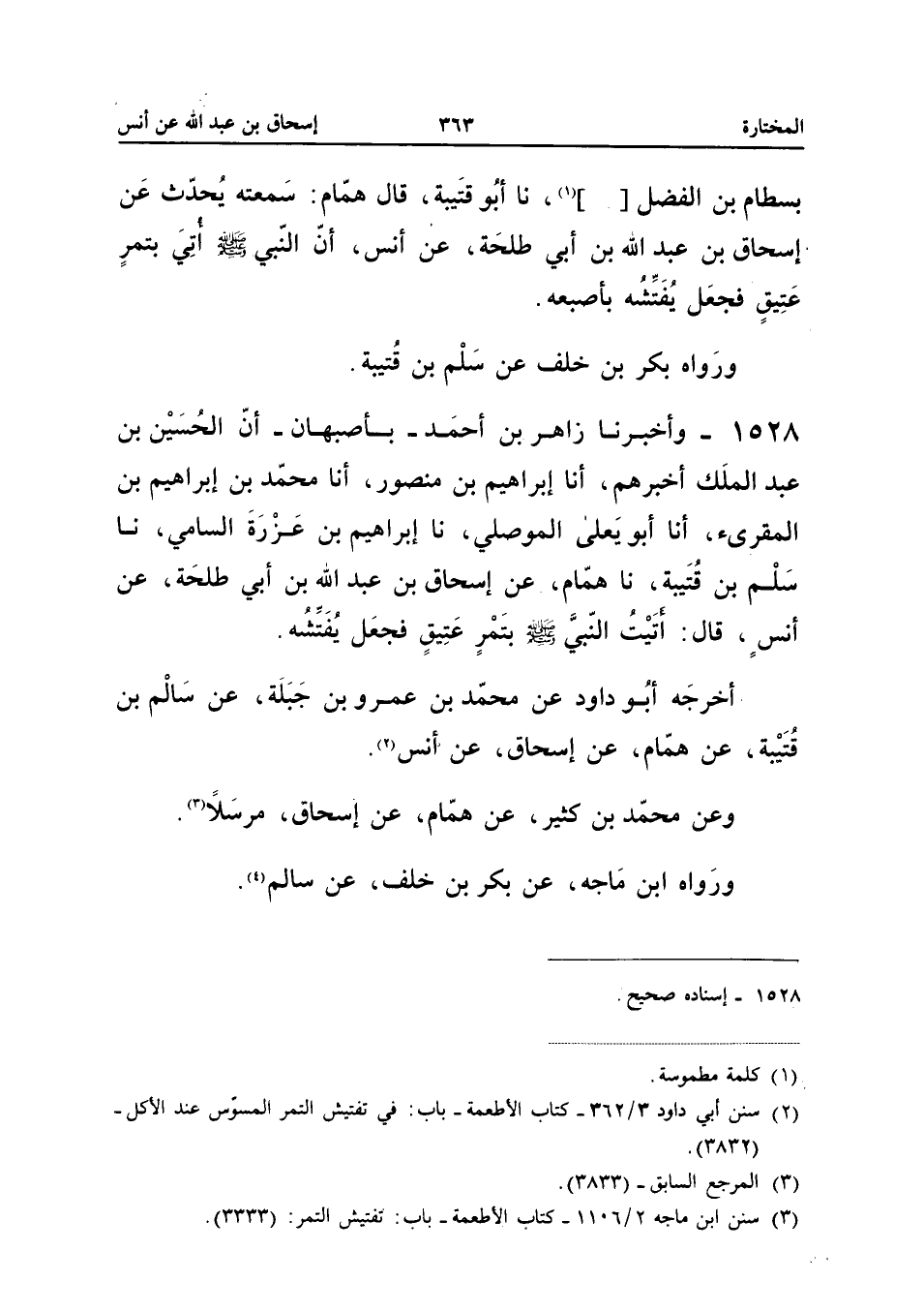 1528 - وَأَخْبَرَنَا زَاهِرُ بْنُ أَحْمَدَ بِأَصْبَهَانَ أَنَّ الْحُسَيْنَ بْنَ عَبْدِ الْمَلِكِ أَخْبَرَهُمْ أَنا إِبْرَاهِيمُ بْنُ مَنْصُور أَنا مُحَمَّدُ بْنُ إِبْرَاهِيمَ بْنِ الْمُقْرِئِ أَنا أَبُو يَعْلَى الْمَوْصِلِيُّ نَا إِبْرَاهِيمُ بْنُ عَزْرَةَ السَّامِيُّ نَا سَلْمُ بْنُ قُتَيْبَةَ نَا هَمَّامٌ عَنْ إِسْحَاقُ بْنُ عَبْدِ اللَّهِ بْنِ أَبِي طَلْحَةَ عَنْ أَنَسٍ قَالَ أَتَيْتُ النَّبِيَّ صَلَّى اللَّهُ عَلَيْهِ وَسَلَّمَ بِتَمْرٍ عَتِيقٍ فَجَعَلَ يُفَتِّشُهُ أَخْرَجَهُ أَبُو دَاوُدَ عَنْ مُحَمَّدِ بْنِ عَمْرِو بْنِ جَبَلَةَ عَنْ سَالِمِ بْنِ قُتَيْبَةَ عَنْ هَمَّامٍ عَنْ إِسْحَاقَ عَنْ أَنَسٍ وَعَنْ مُحَمَّدِ بْنِ كَثِيرٍ عَنْ هَمَّامٍ عَنْ إِسْحَاقَ مُرْسَلا وَرَوَاهُ ابْنُ مَاجَهْ عَنْ بَكْرِ بْنِ خَلَفٍ عَنْ سَالم
