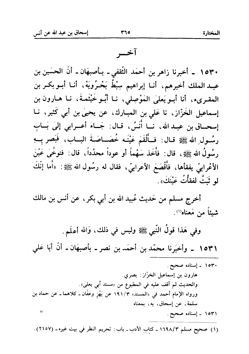 1530 - أَخْبَرَنَا زَاهِرُ بْنُ أَحْمَدَ الثَّقَفِيُّ بِأَصْبَهَانَ أَنَّ الْحُسَيْنَ بْنَ عَبْدِ الْمَلِكِ أَخْبَرَهُمْ أَنا إِبْرَاهِيمُ سبط بحرويه أَنا أَبُو بكر بن الْمُقْرِئِ أَنا أَبُو يَعْلَى الْمَوْصِلِيُّ نَا أَبُو خَيْثَمَةَ نَا هَارُونُ بْنُ إِسْمَاعِيلَ الْخَزَّازُ نَا عَلِيُّ بْنُ الْمُبَارَكِ عَنْ يَحْيَى بْنِ أَبِي كَثِيرٍ نَا إِسْحَاقُ بْنُ عَبْدِ اللَّهِ نَا أَنَسٌ قَالَ جَاءَ أَعْرَابِيٌّ إِلَى بَابِ رَسُولِ اللَّهِ صَلَّى اللَّهُ عَلَيْهِ وَسَلَّمَ قَالَ فَأَلْقَمَ عَيْنَهُ خُصَاصَةَ الْبَابِ فَبَصُرَ بِهِ رَسُولُ اللَّهِ صَلَّى اللَّهُ عَلَيْهِ وَسَلَّمَ قَالَ فَأَخَذَ سَهْمًا أَوْ عُودًا مُحَدَّدًا قَالَ فَتَوَخَّى عَيْنَ الأَعْرَابِيَّ يَفْقَأُهَا فَأَقْصَعَ الأَعْرَابِيُّ فَقَالَ لَهُ رَسُولُ اللَّهِ صَلَّى اللَّهُ عَلَيْهِ وَسَلَّمَ أَمَا إِنَّكَ لَوْ ثَبَتَّ لَفَقَأْتُ عَيْنَكَ أَخْرَجَ مُسْلِمٌ مِنْ حَدِيثِ عُبَيْدِ اللَّهِ بْنِ أَبِي بَكْرٍ عَنْ أَنَسِ بْنِ مَالِكٍ شَيْئًا مِنْ مَعْنَاهُ وَفِي هَذَا قَوْلُ النَّبِيِّ صَلَّى اللَّهُ عَلَيْهِ وَسَلَّمَ وَلَيْسَ فِي ذَلِك وَالله اعْلَم إِسْنَاده صَحِيح